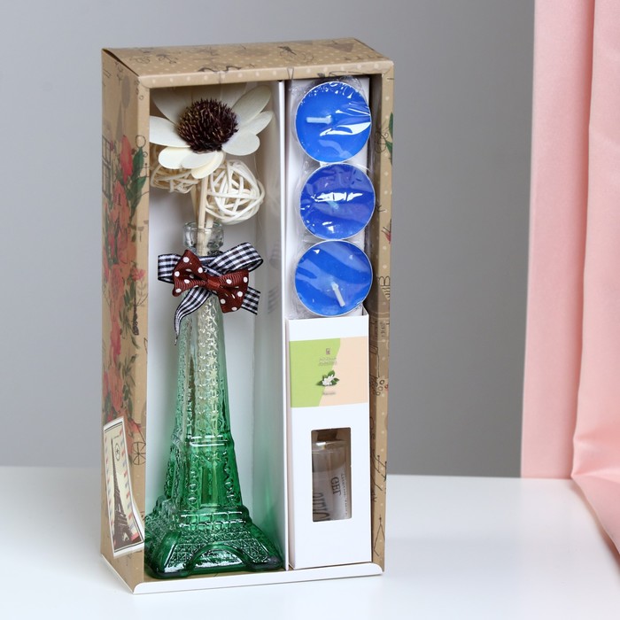 Ароматизатор, съдържащ ваза във формата на Айфеловата кула, с пръчици, 3 свещи и аромомасло 30 мл.
