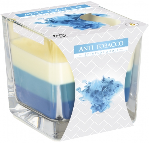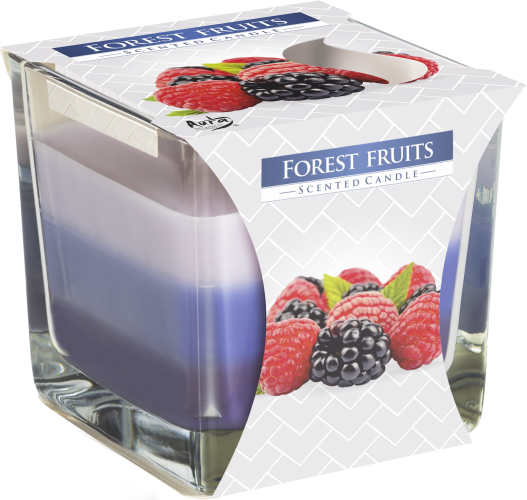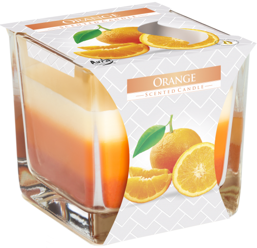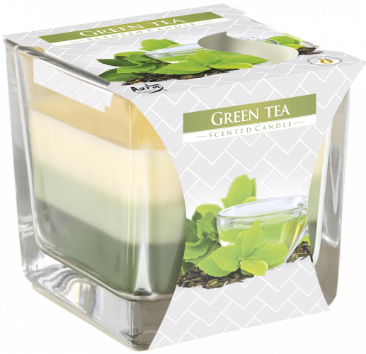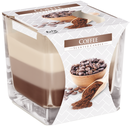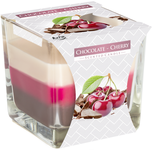 Свещите са в квадратна стъклена чаша с трицветен пълнеж с различни аромати.