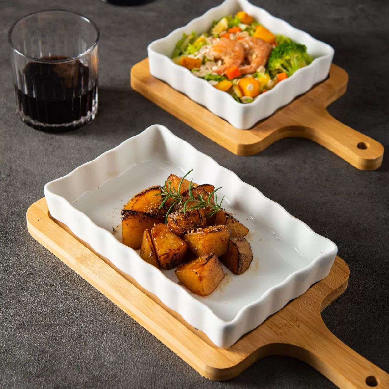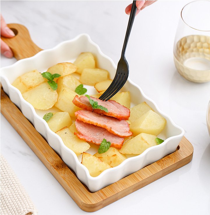 Креативно правоъгълно плато за сервиране, изработено от порцелан, с красив дизайн в бял цвят и с размери 24х15 см.
