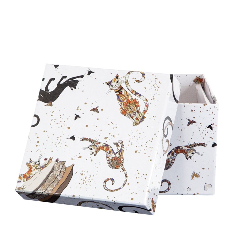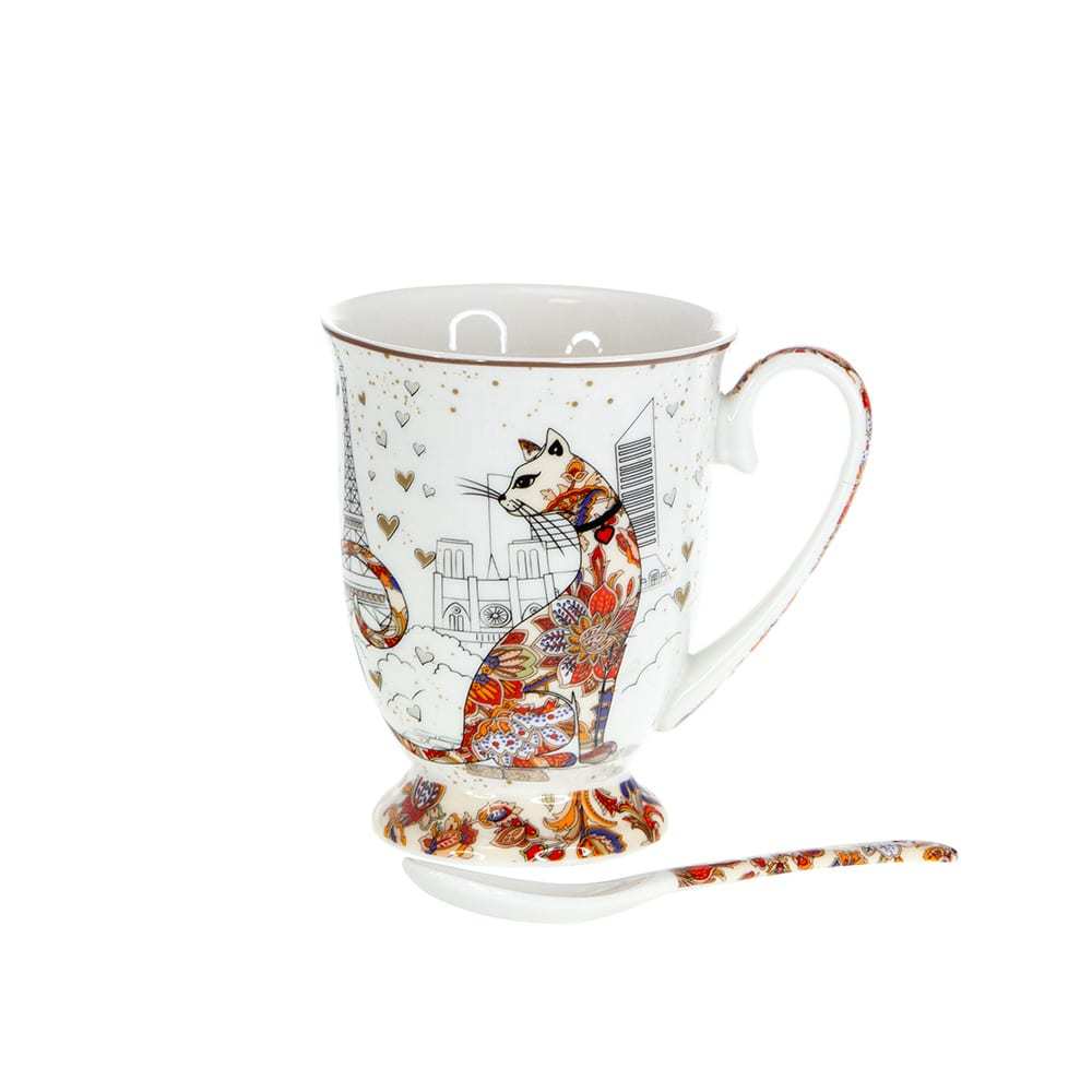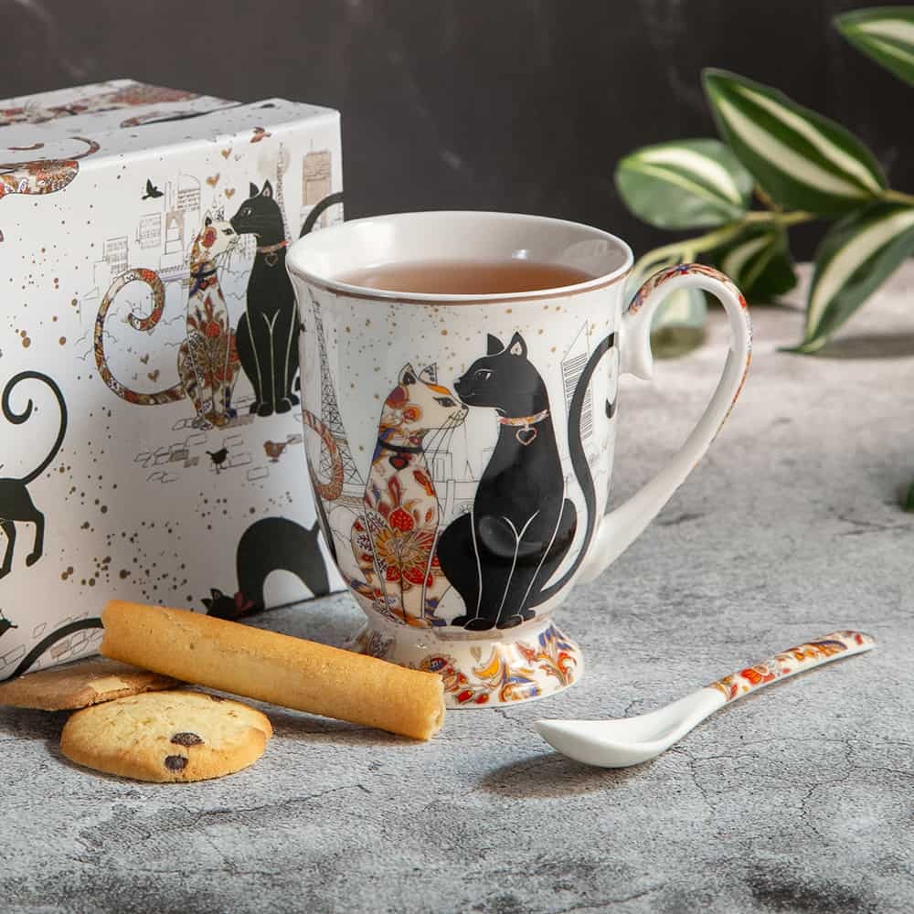 Елегантна чаша с лъжичка от фин порцелан, с красив дизайн на черна котка.
