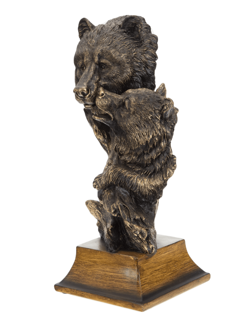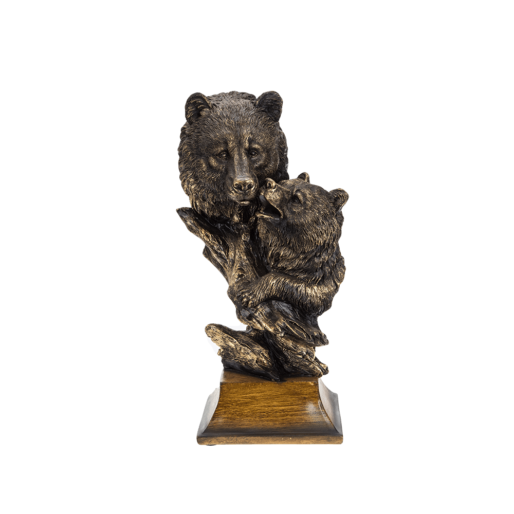 Стилна декоративна фигура - мечка с мече, изработена от полимерна смола, с размер 15х23х13.5 см.