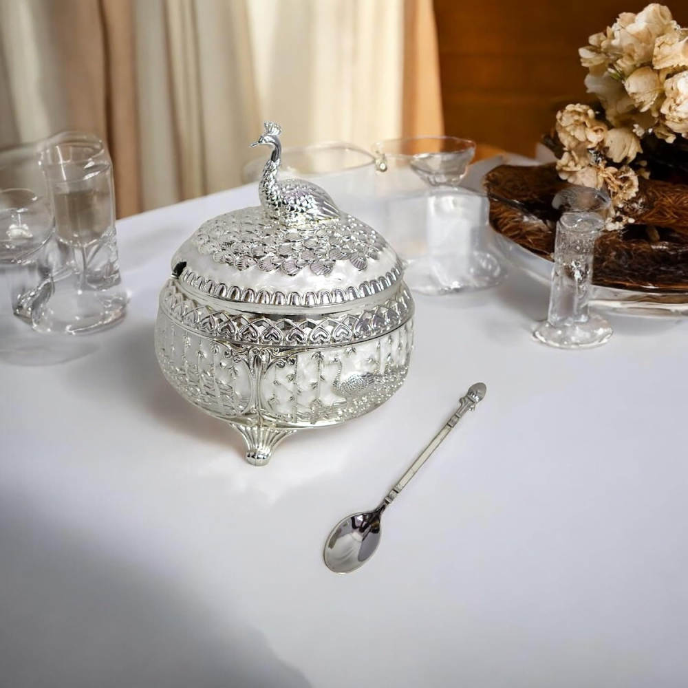 Декоративната захарница с Пауно е елегантен акцент за дома и изискан избор за подарък при сватба, рожден ден, годишнина или празничен повод. Този красив съд е създаден за стилно поднасяне на захар, дребни бонбони и други малки лакомства, като съчетава практична употреба с впечатляваща визия. Орнаменталният дизайн с паун придава луксозно излъчване и превръща продукта в чудесно допълнение към масата, витрината или декоративния кът у дома.