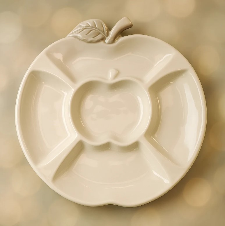 Керамично бяло плато под формата на ябълка със сивкава дръжка и листо.