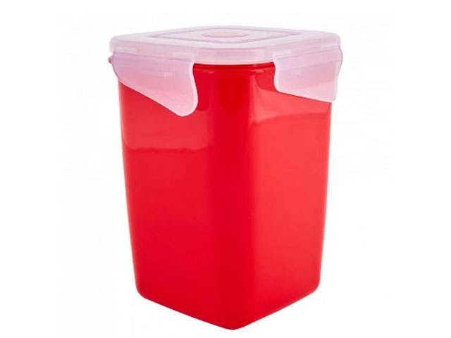 Изработен е от качествен полипропилен. С красив дизайн в цвят червено кадифе и с прозрачен капак със заключване, снабден с 4 скоби, което осигурява плътното му прилепване и предотвратява внезапното отваряне. Идеален е за съхранение на насипни хранителни продукти.