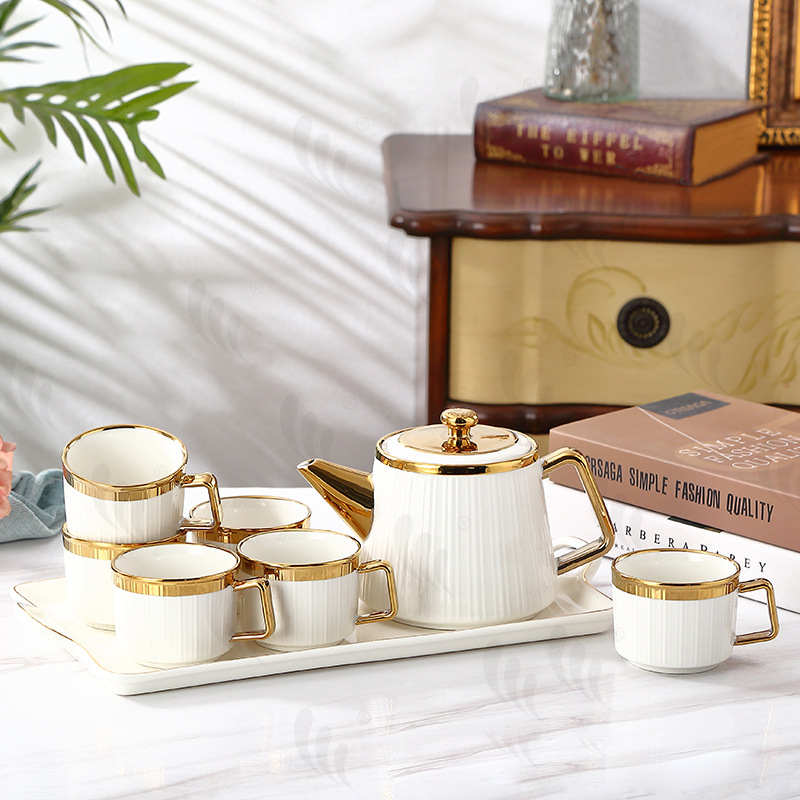 Елегантен керамичен сервиз за чай в бяло и златно с поднос