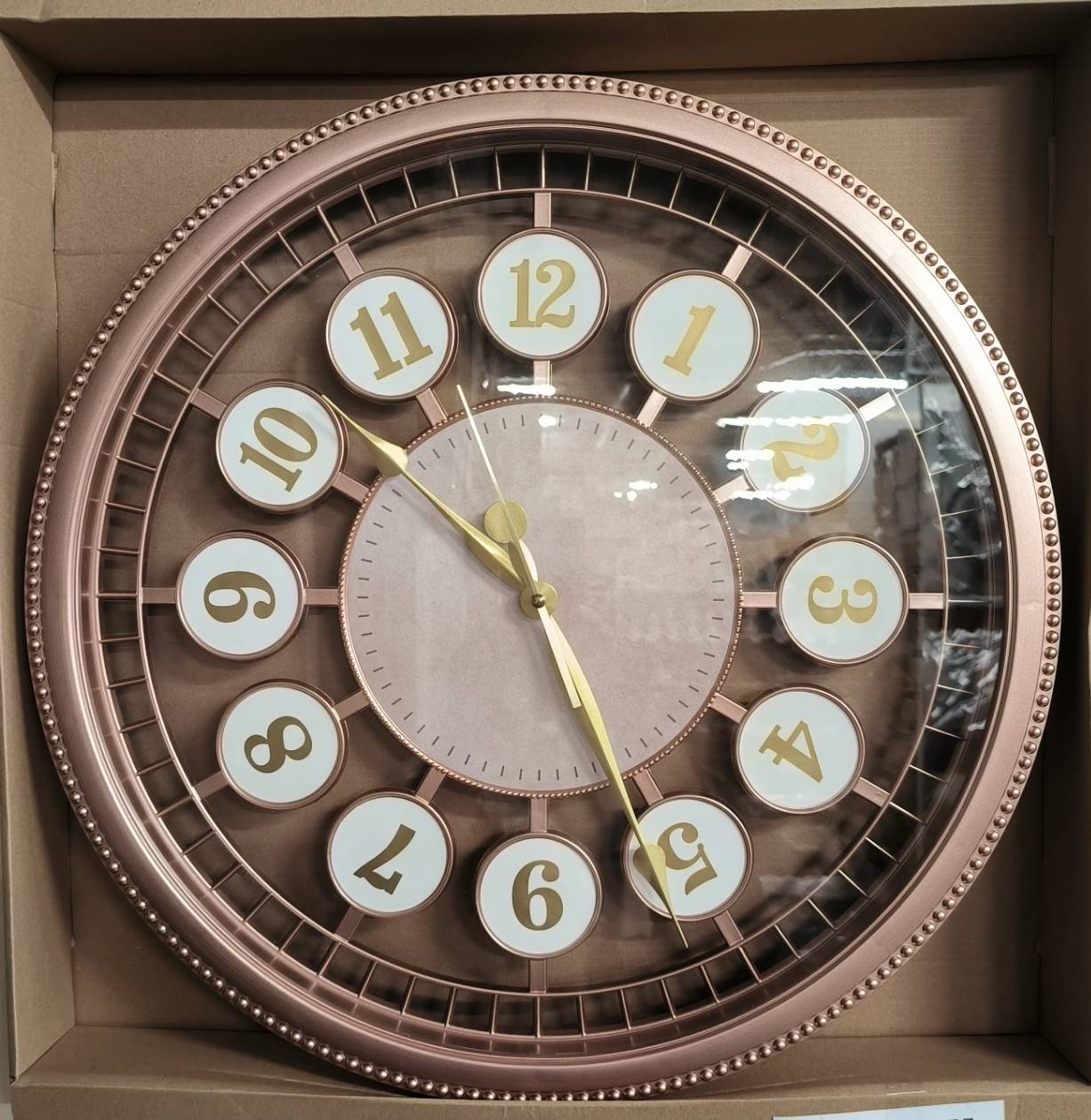 Придайте на вашето пространство допълнителен шик с този елегантен стенен часовник, изработен от пластмаса и метал в прекрасен цвят "розово злато". С диаметър от 50 см, този часовник привлича вниманието със своя изискан дизайн и златистите арабски цифри върху белия фон.