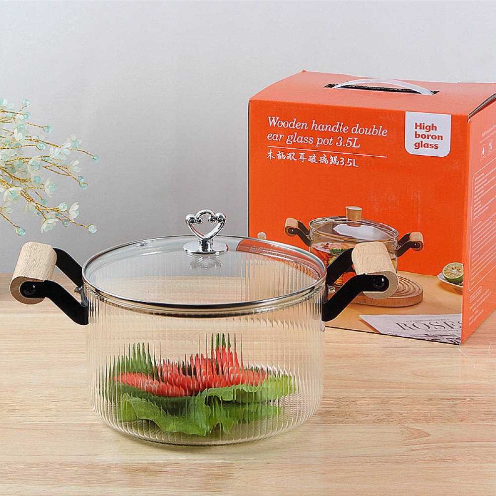 Голяма стъклена тенджера 3.5 л – боросиликатно стъкло, метал и дърво