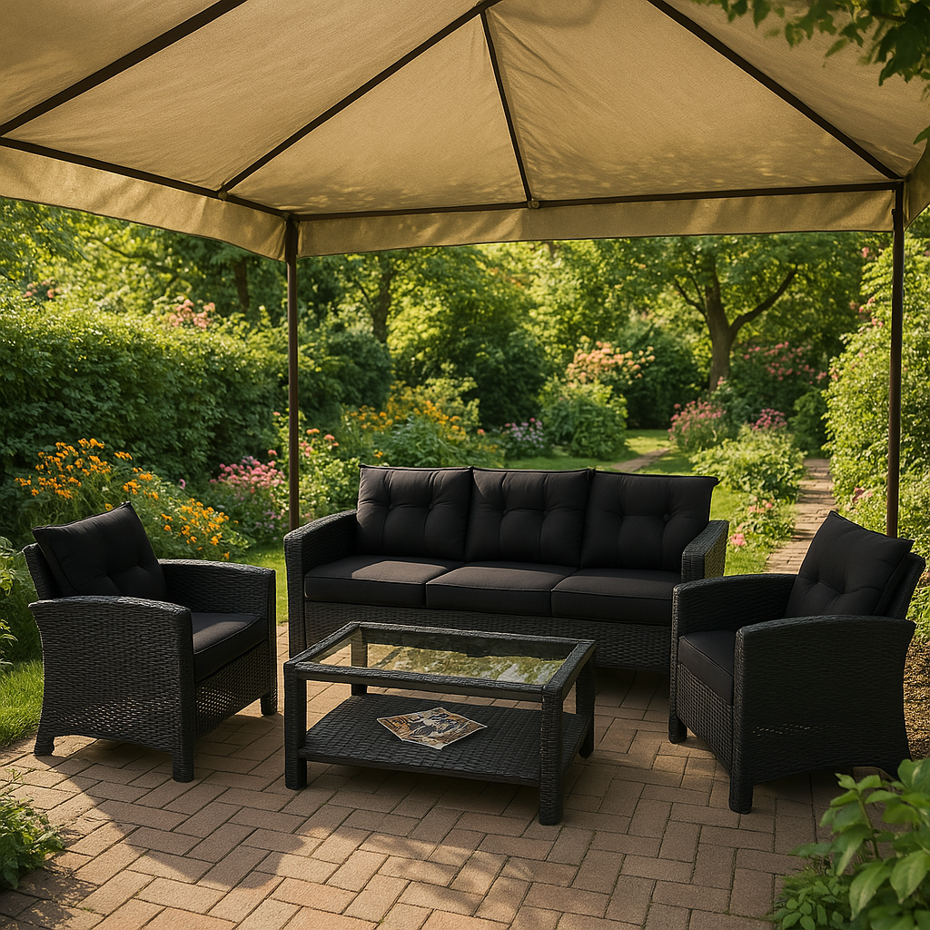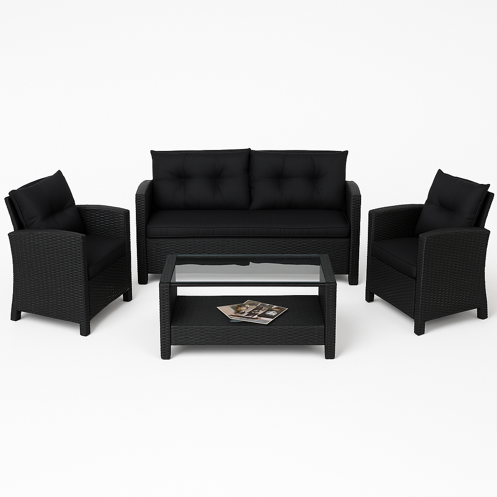 Възглавници с пълнеж от пяна с дебелина 5 см и цип, тапицерия с тегло 230 гр/м², пластмасови крака.