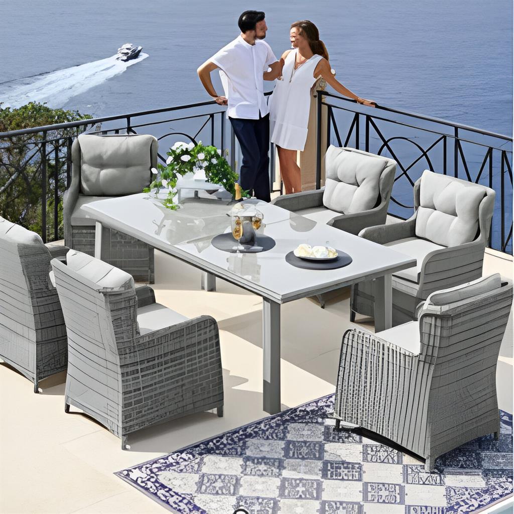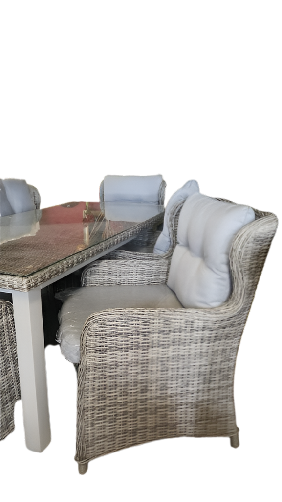 Градински комплект включва: 1 x маса + 6 x стола.Алуминиева конструкция, полу-кръгъл и кръгъл ратан.