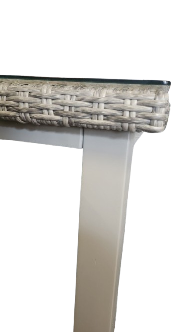 Маса 170x90 см с пълно плетене и закалено ясно стъкло с дебелина 5 мм, крака от акация, сгъваеми.