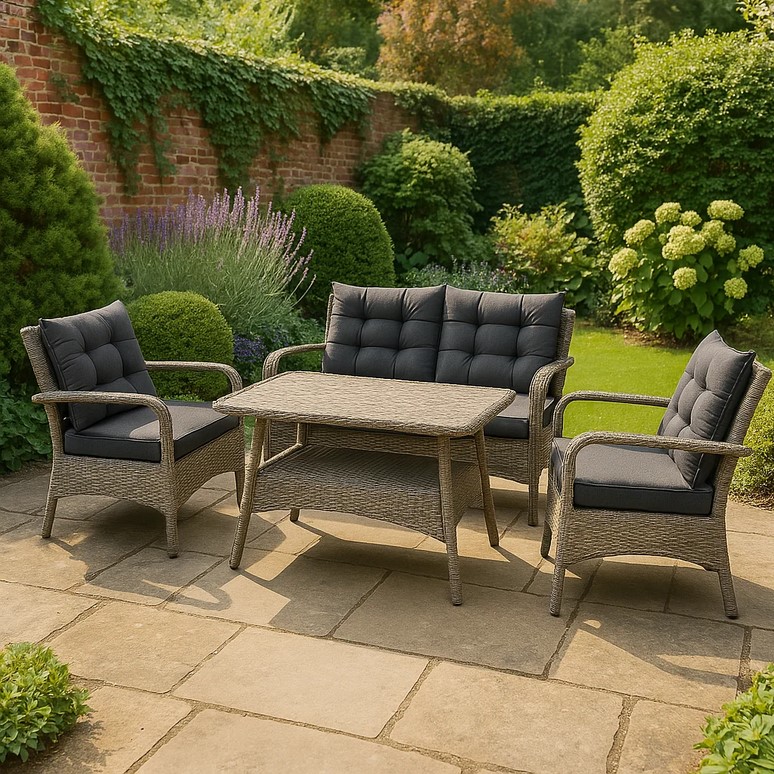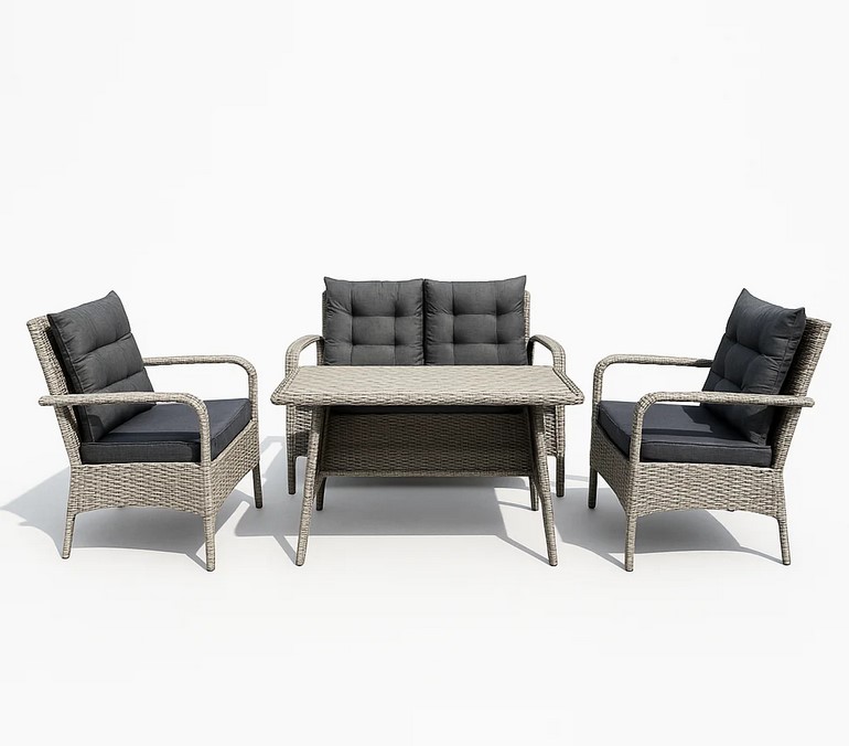 - Характеристики: Стоманена конструкция, плосък сив ратан, с възглавница с дебелина 8 см.