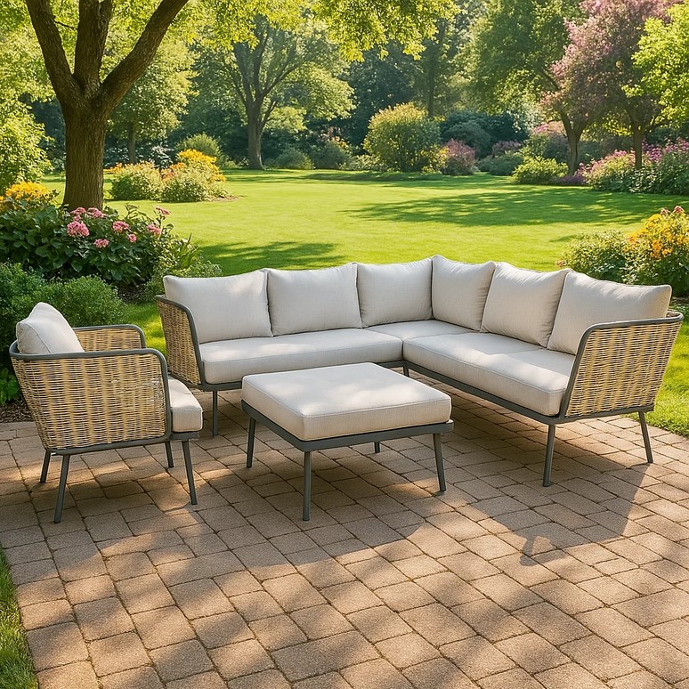 - Кръгъл ратан: 7 мм. Размери: 222/204 x 77/68 x 76/45/33 см.