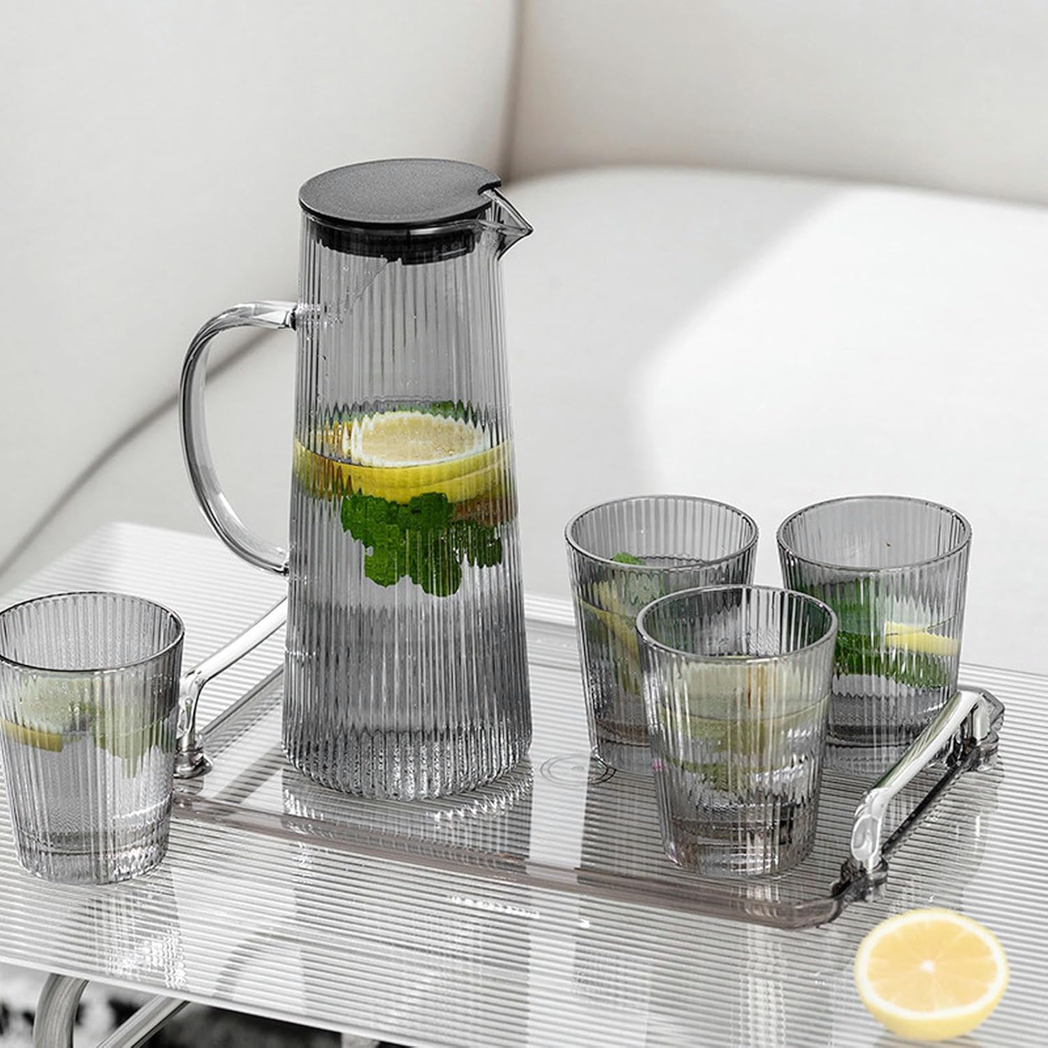 Търсите елегантно и практично решение за сервиране на напитки у дома или в офиса? Комплектът със стъклена кана 1250 мл и 4 чаши върху стилен поднос ще се впише идеално във всяка всекидневна, кухня или търговски обект. Подходящ за чай, вода, сок и студени напитки.