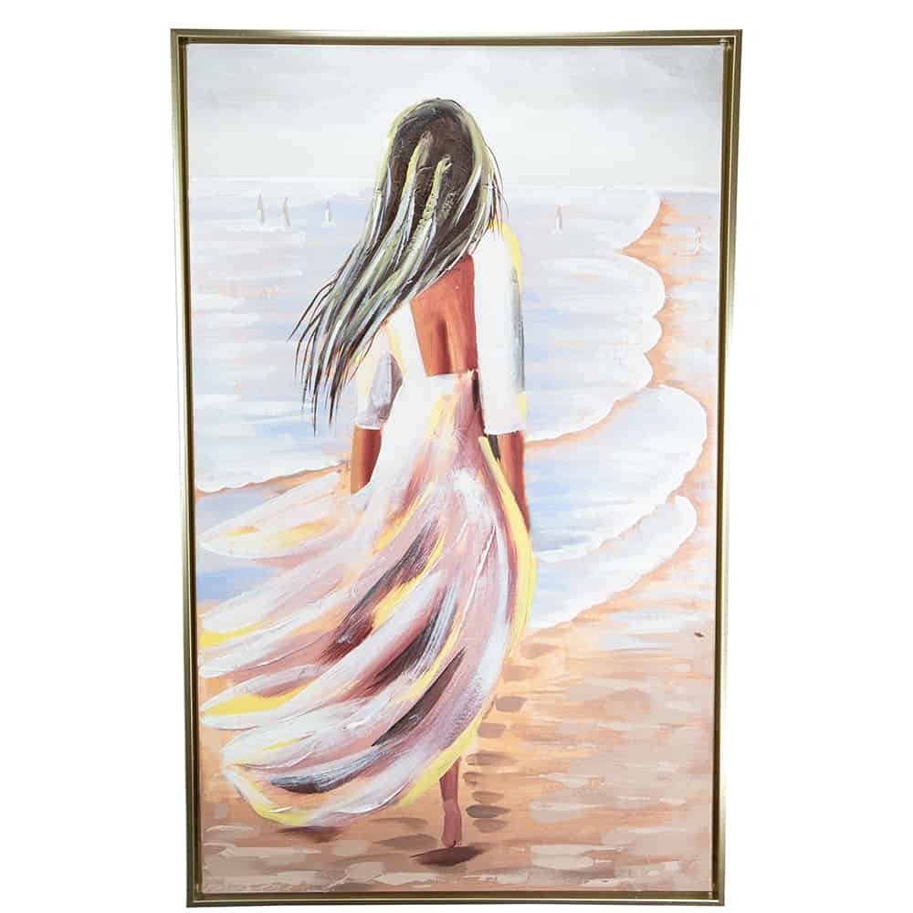 Картина "Жена и море" е изящно произведение на изкуството, което съчетава принт върху платно с ръчно нанесени маслени бои. Този декоративен арт е подходящ за всеки, който търси да внесе спокойствие и елегантност в дома или офиса си, създавайки уютна атмосфера с морска тематика.