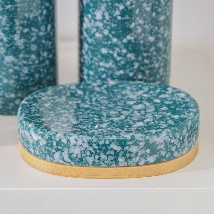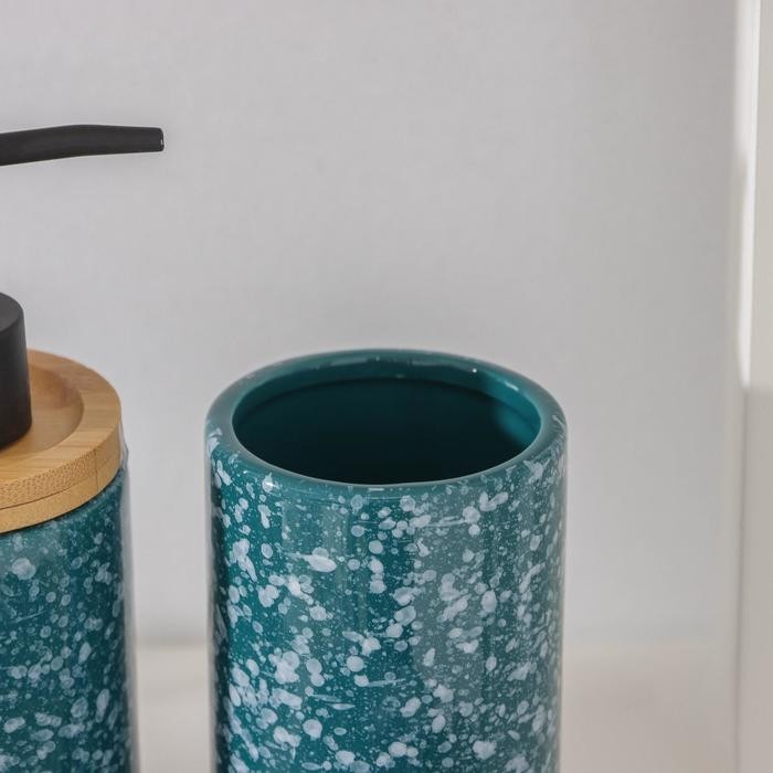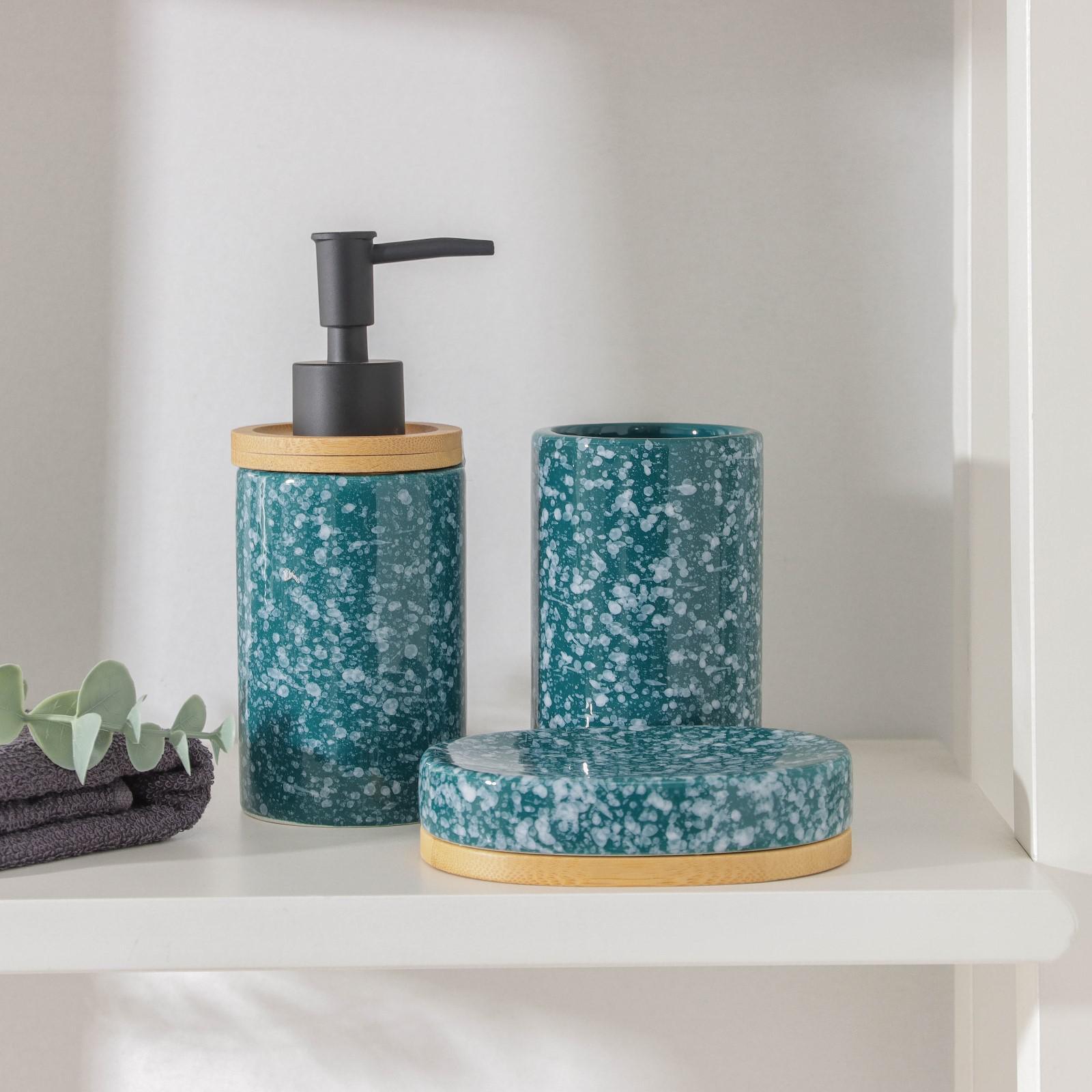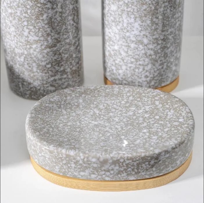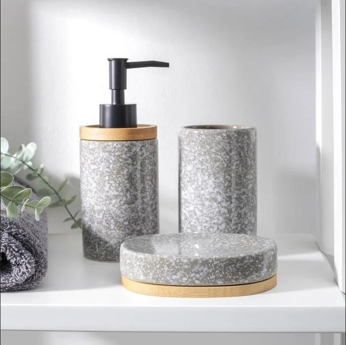 Комплектът е изработен от керамика, бамбук и метал в три части.
