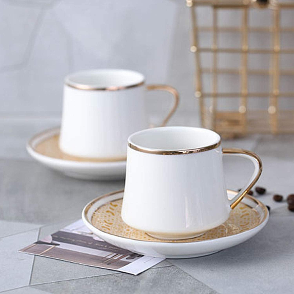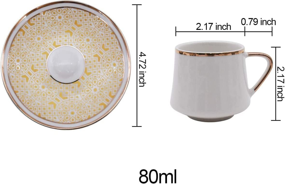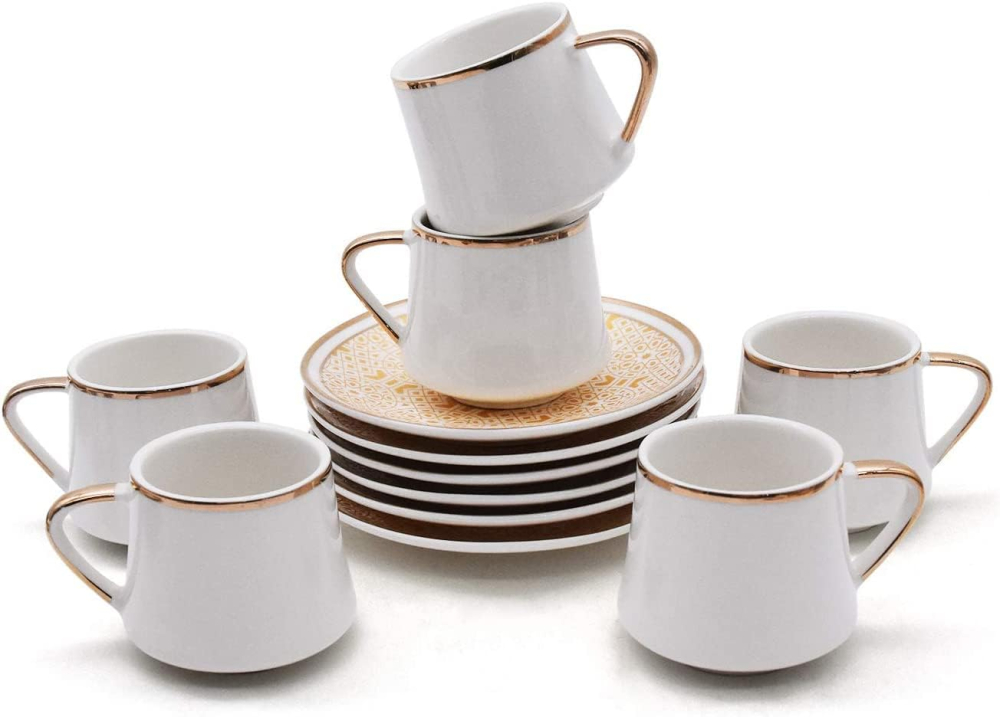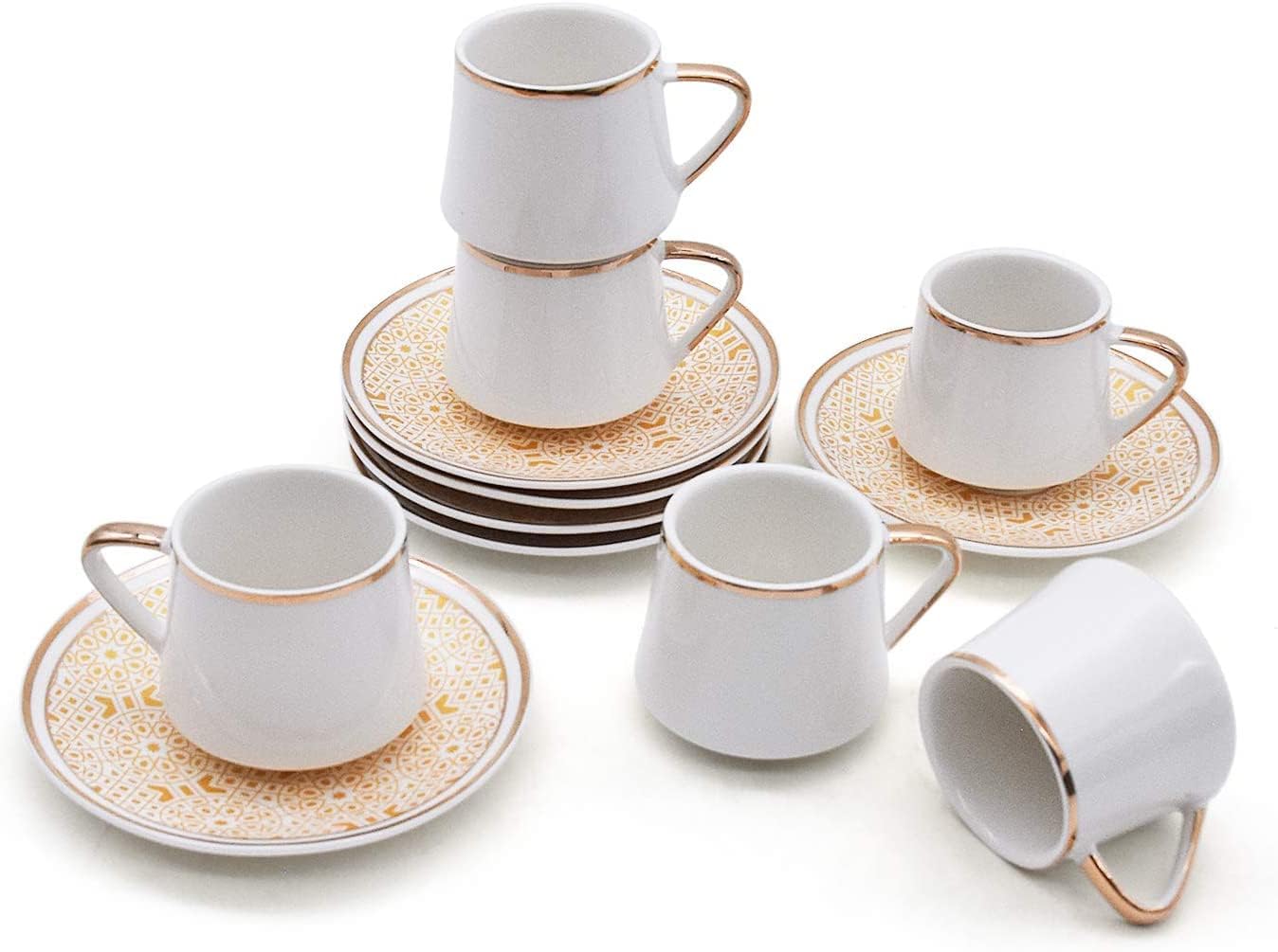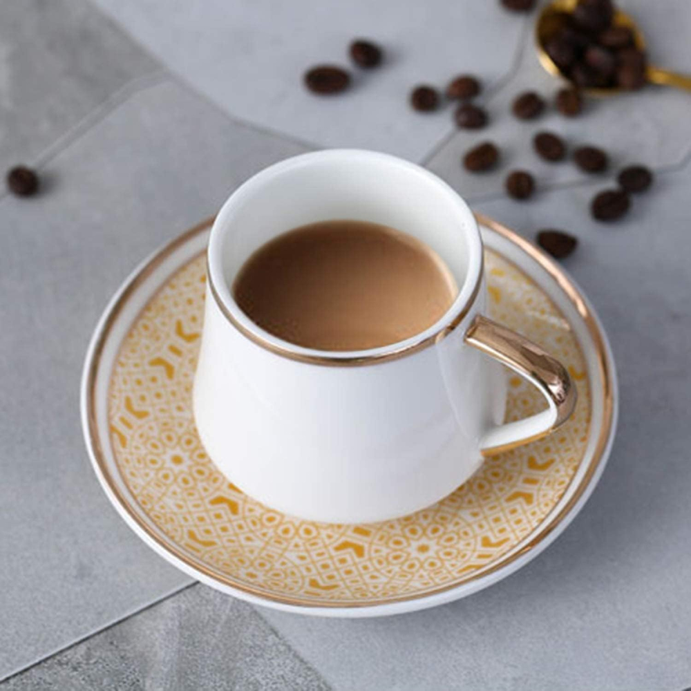 Насладете се на ароматно еспресо със стил с елегантния комплект от 6 керамични еспресо чашки със златен кант и чинийки. Изработени от висококачествен порцелан, те са здрави, безопасни и подходящи за всекидневна употреба или специални поводи.