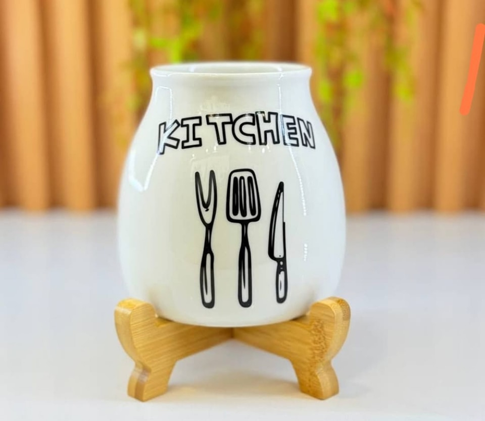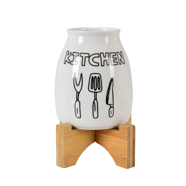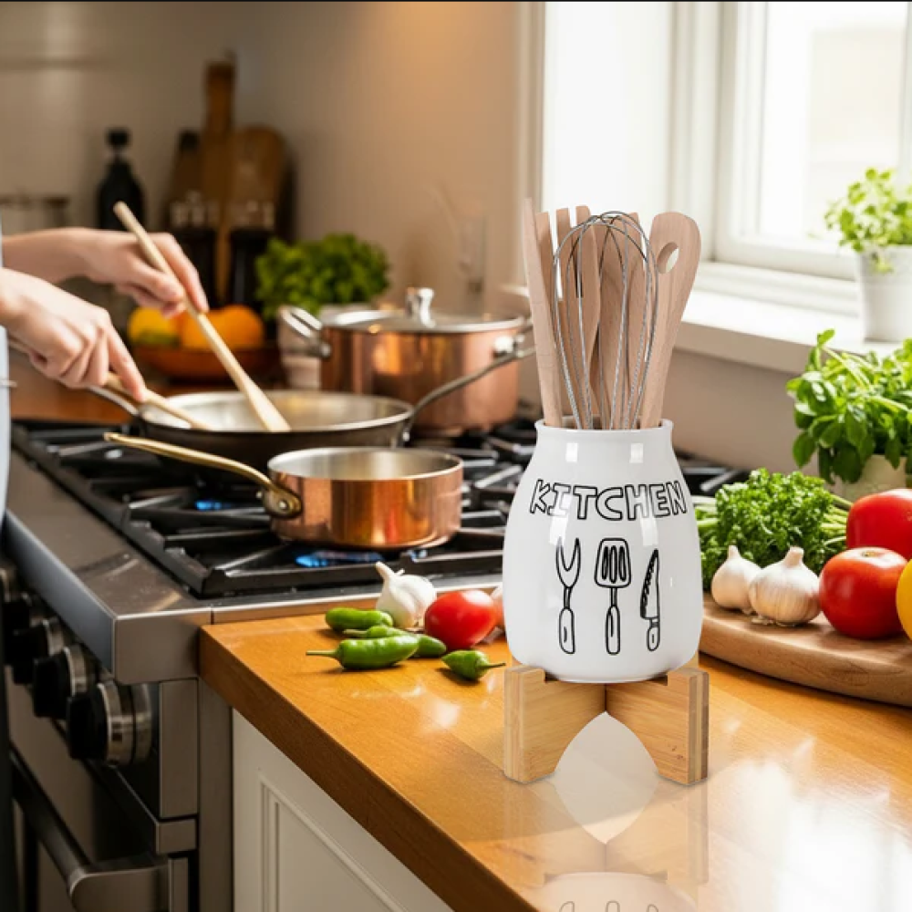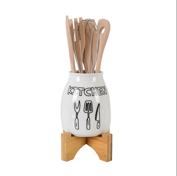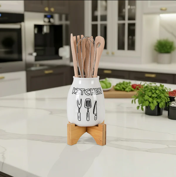 Внесете елегантност и функционалност в готвенето с керамичния кухненски комплект с дървена стойка. Съчетавайки модерен дизайн и практичност, този стилен сет включва керамичен държач за прибори, еко дървени шпатули и метална бъркалка – всичко необходимо за подреден и ефективен кухненски кът.