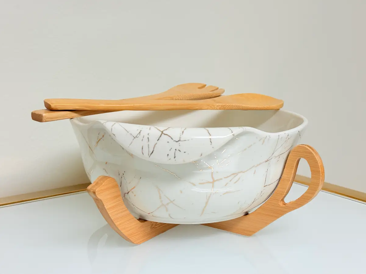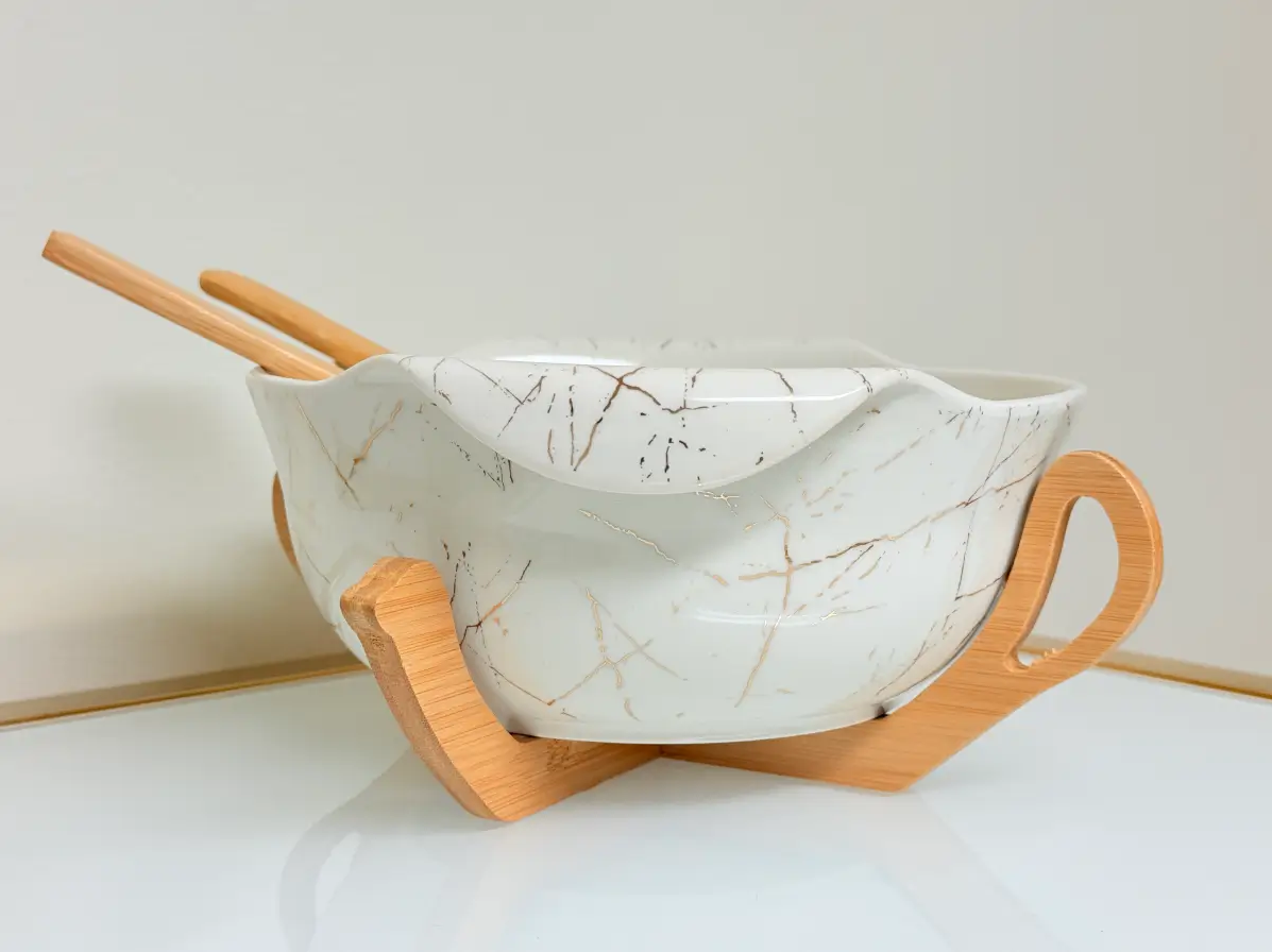 Освежете начина, по който сервирате, с този елегантен керамичен комплект за салата с дълбока овална форма и изискани детайли. Бялата керамична купа с фини златни мраморни жилки придава луксозно, но универсално излъчване, което пасва идеално на всеки интериор и подредба на масата.