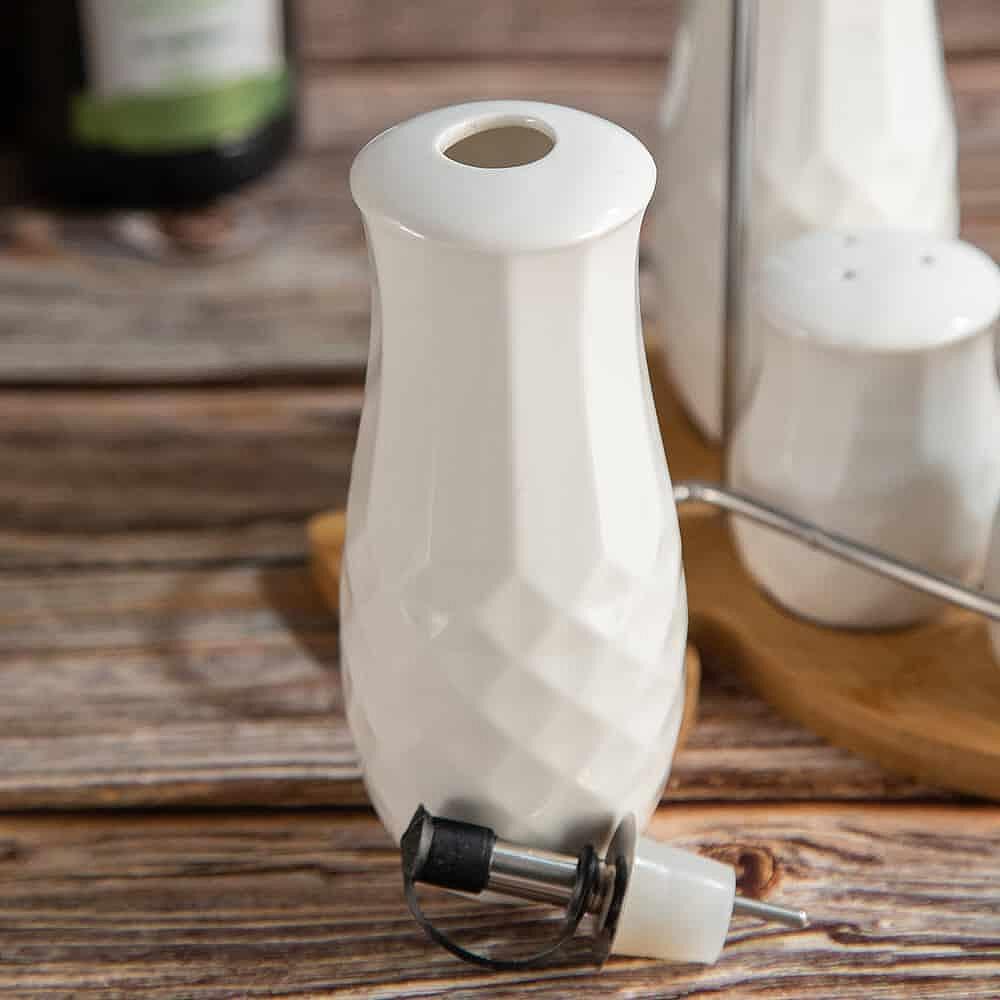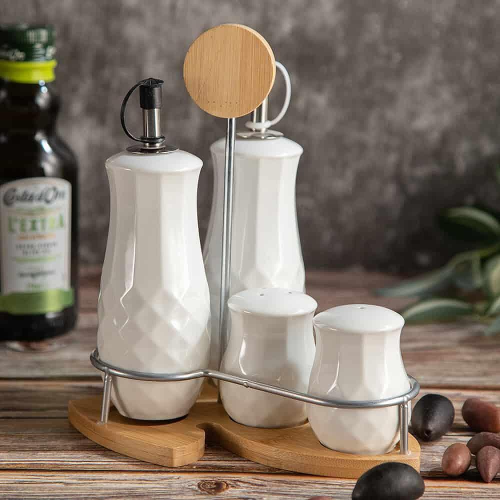 Той съдържа бутилка за масло, бутилка за оцет, солничка и пеперница на на бамбукова поставка.