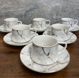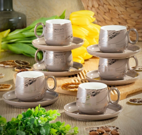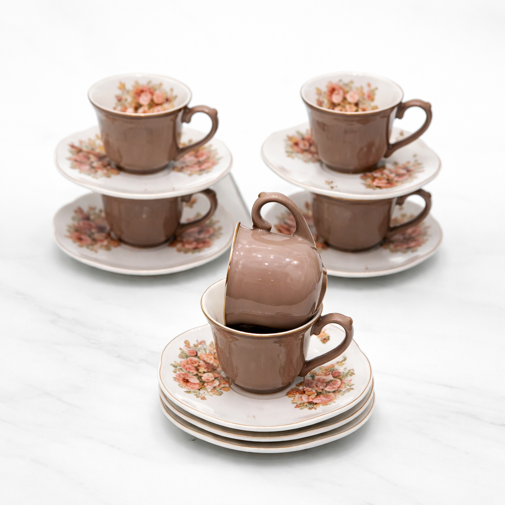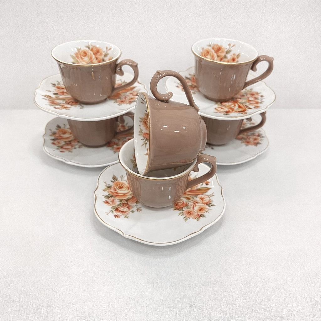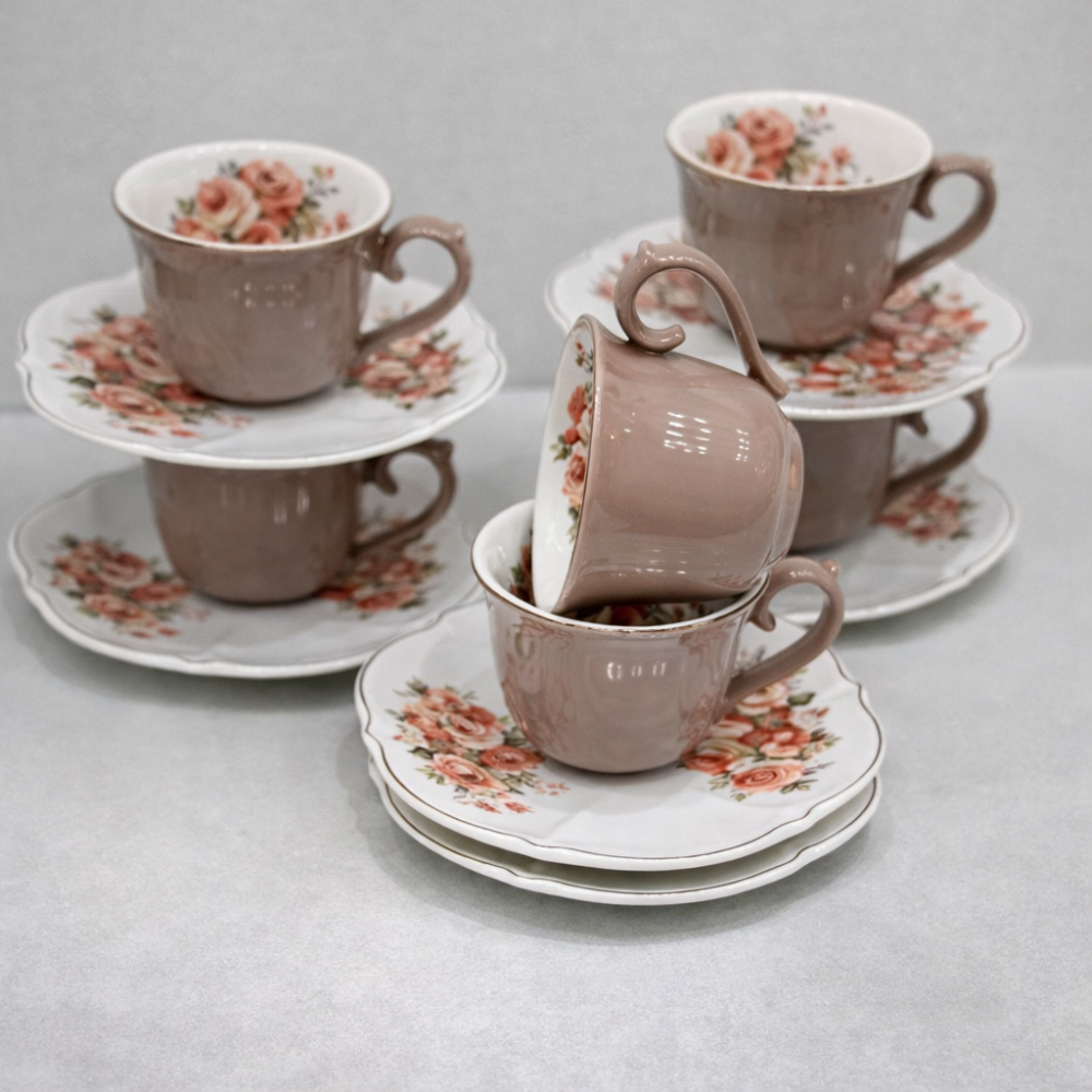 Керамичен сервиз за кафе или чай „Кафяв с Рози“ – 6 чаши с чинийки