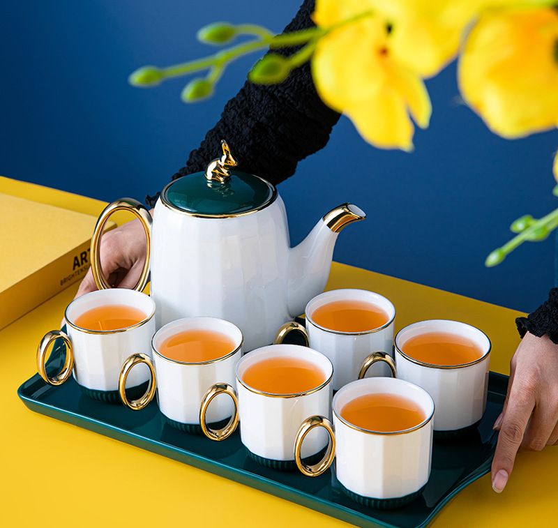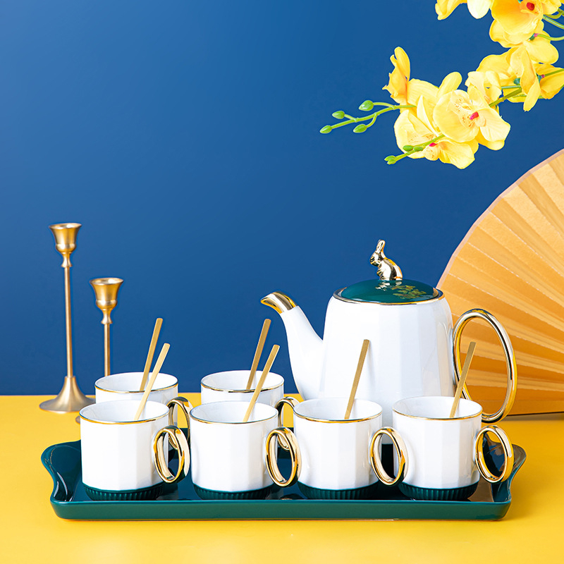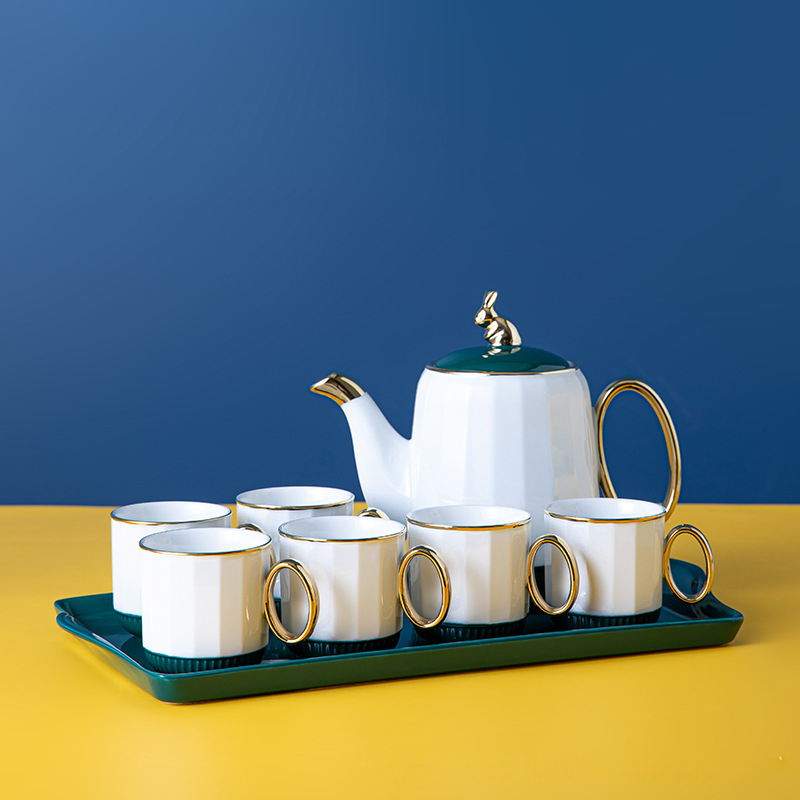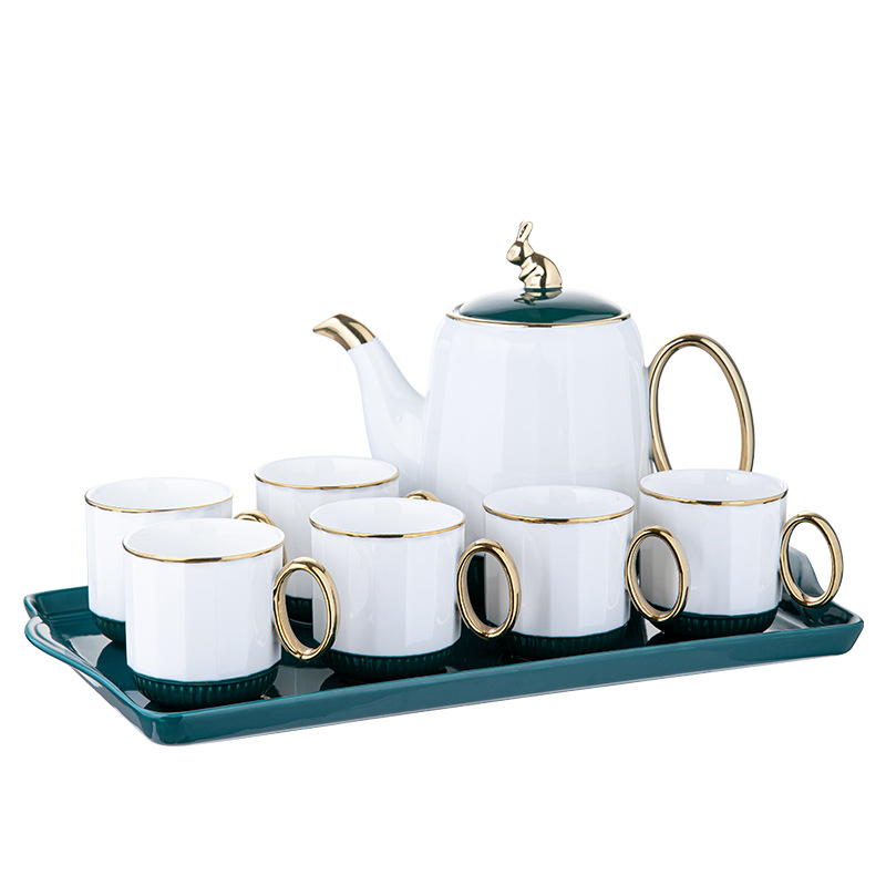 Керамичен сервиз за чай "Rabbit" в зелено и бяло с поднос