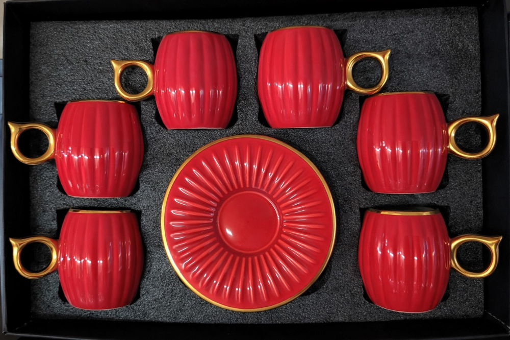 Керамичен сервиз за кафе 90 мл – червено и златно е изискан избор за ценителите на стилното поднасяне. Този сервиз за кафе впечатлява с наситен червен цвят и фини златисти кантове, които придават луксозен акцент на всяка маса. Перфектен за специални поводи или като елегантен подарък.