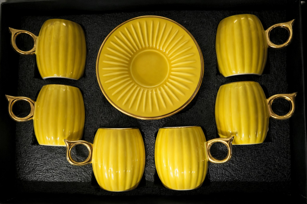 Керамичен сервиз за кафе 90 мл – жълто и златно е стилен акцент за всяка маса и перфектен избор за ценителите на красивото поднасяне. Този сервиз за кафе впечатлява с наситен жълт цвят и изящни златисти кантове, които създават усещане за лукс и топлина при всяко сервиране.