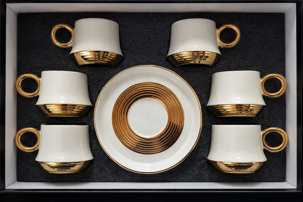 Със своя фин дизайн, този луксозен сервиз за кафе създава усещане за класа при всяко сервиране. Вместимостта от 90 мл е идеална за ароматно еспресо, а керамичният материал подпомага запазването на топлината на напитката. Златистите детайли добавят изтънчен акцент, който превръща всяка кафе пауза в специален момент.