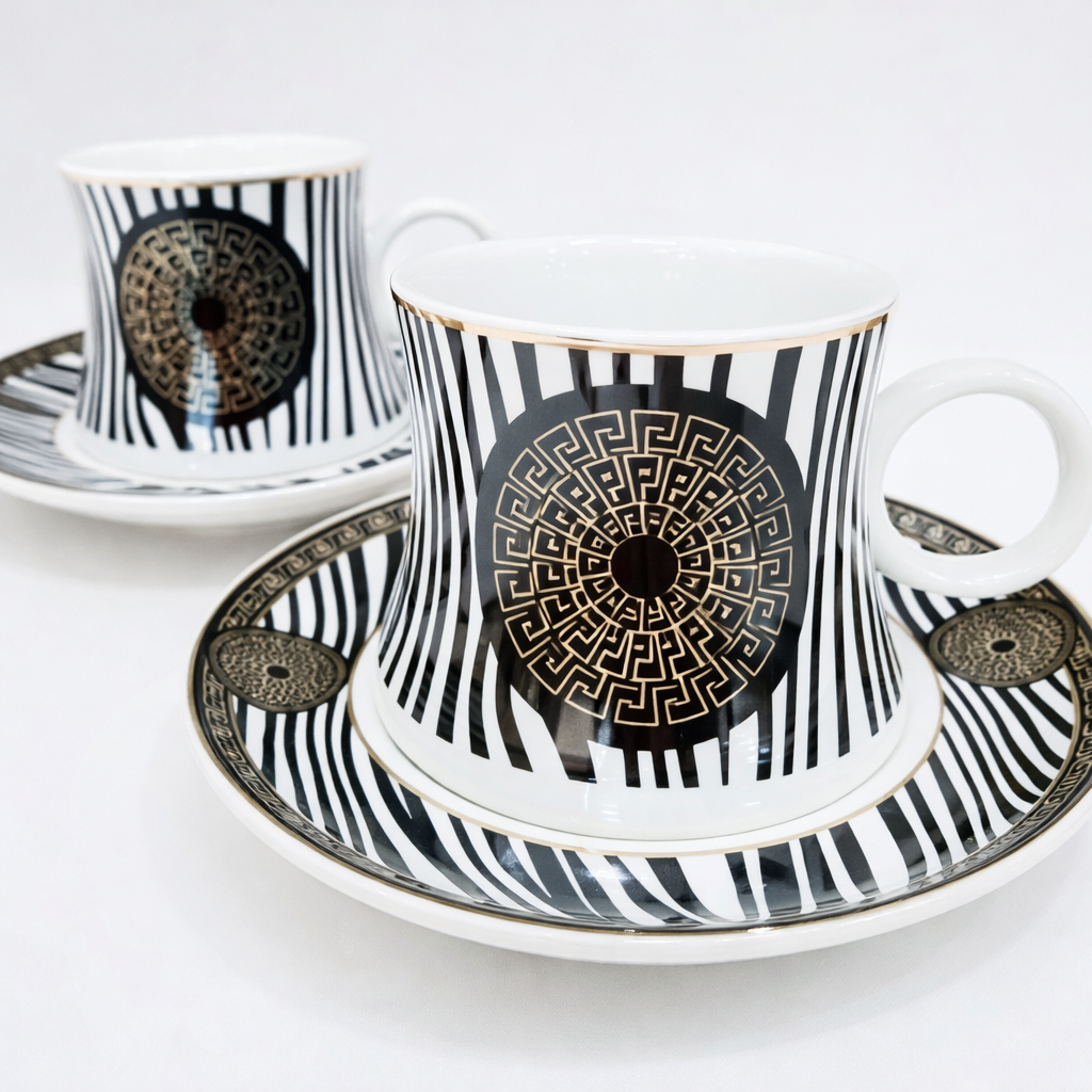 Подчертайте стила си с керамичния кафе сервиз "Зебра", съчетаващ модерен черно-бял дизайн със златисти акценти. Създаден за любителите на изисканото кафе и уникалния дизайн, този комплект ще впечатли всеки гост и ще бъде перфектен избор за подарък.