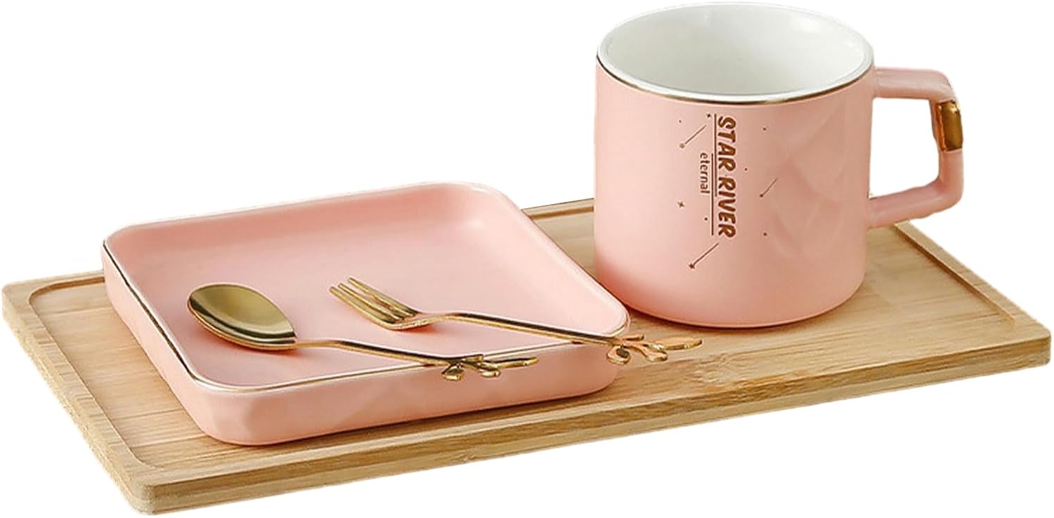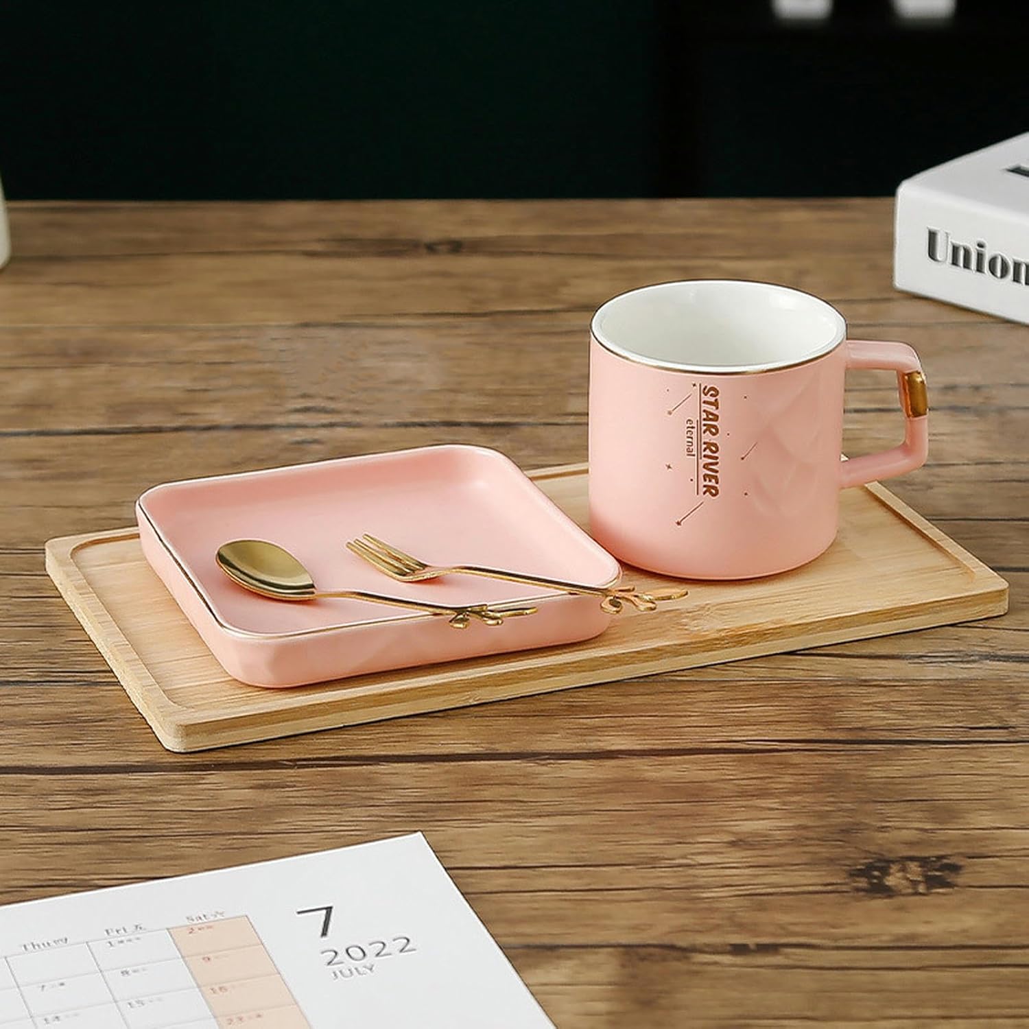 Керамична чаша 150 мл с чинийка бамбукова поставка, лъжичка и виличка – елегантен комплект за следобеден чай и кафе, създаден за комфортно ежедневно ползване у дома или в офиса. Деликатно дебелият ръб с гладка глазура и удобната дръжка осигуряват приятно отпиване и стабилен захват, а качествената керамика задържа топлината по-дълго.