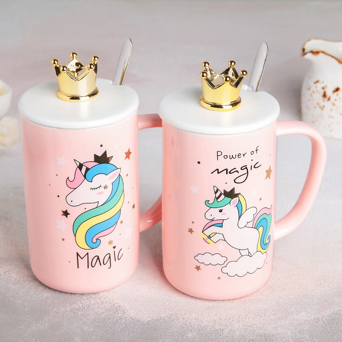 Керамична чаша с принт на "Еднорог" в розов цвят и бяло керамично капаче с корона.
