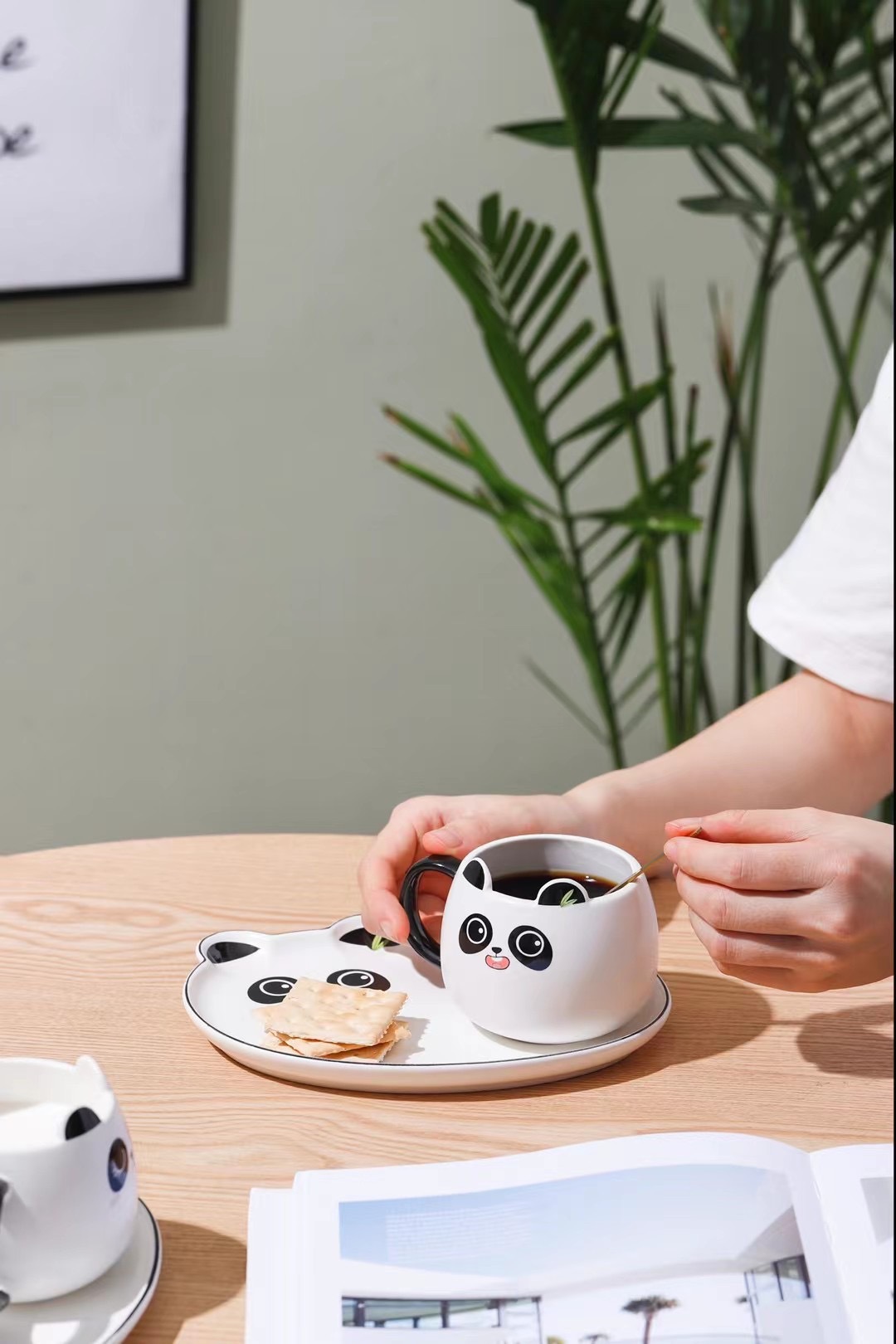 Керамичната чаша с поднос и лъжичка "Панда" е очарователен комплект, който съчетава функционалност и забавен дизайн. С вместимост от 200 мл, тя е идеална за любителите на топли напитки като кафе, чай или мляко. Този комплект създава уютна атмосфера и е подходящ както за ежедневна употреба, така и за специални моменти.