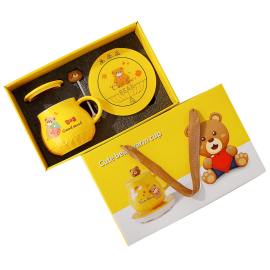 Чашата е изработена от керамика в жълт цвят с различни принтове на мече.