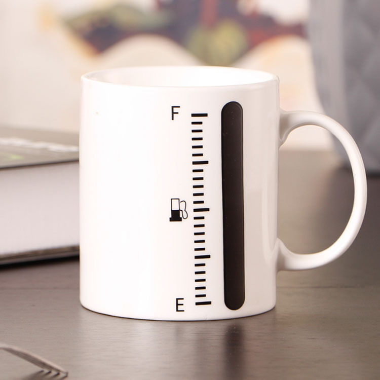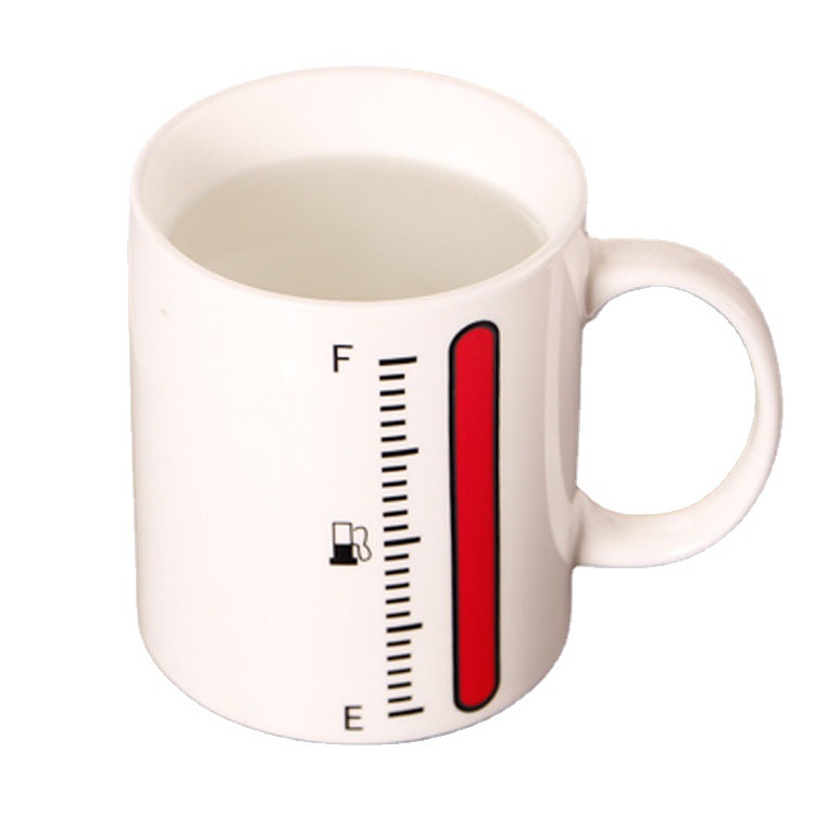 Когато чашата се напълни с топла течност, скалата се запълва и става червена.