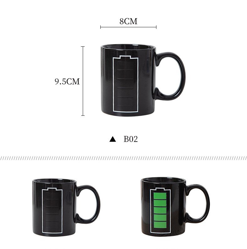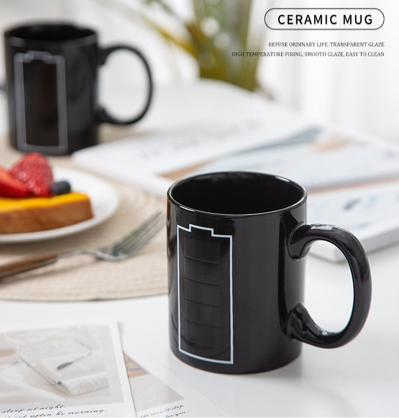 На нея има изобразена контурите на батерия и когато чашата се напълни с топла течност, батерията се оцветява в зелено.