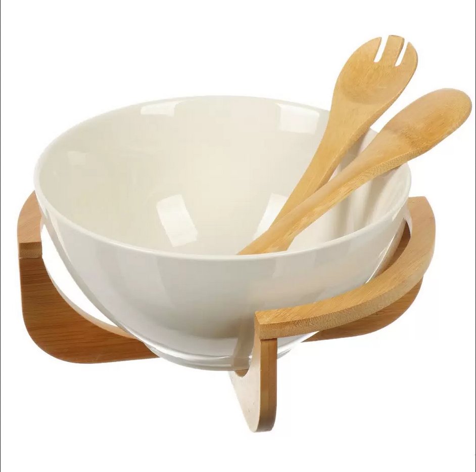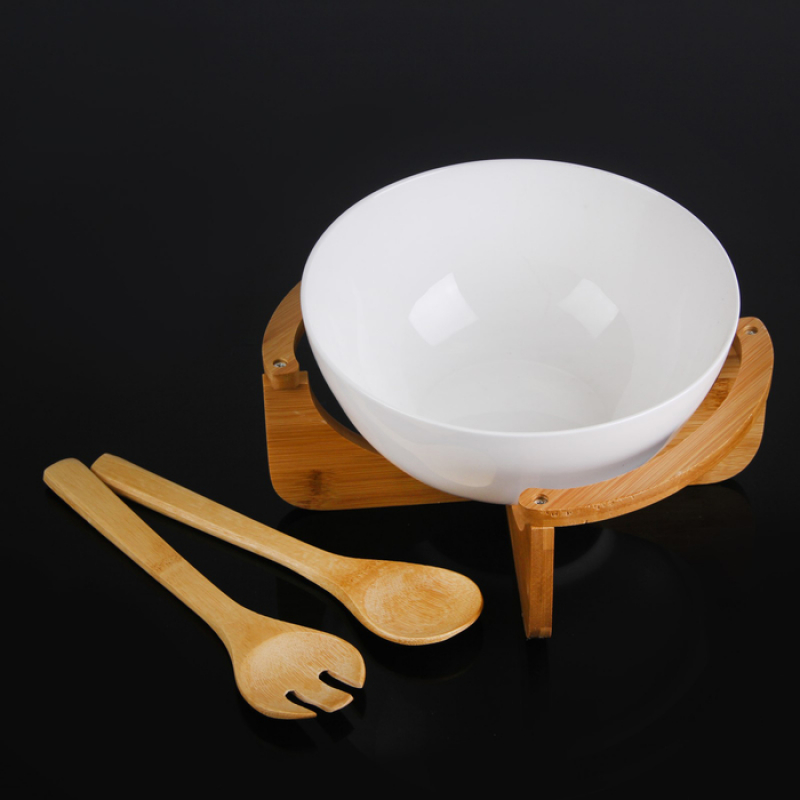 Комплект от керамична купа, дървени вилица и лъжица за салата с бамбукова поставка.