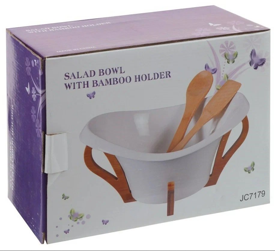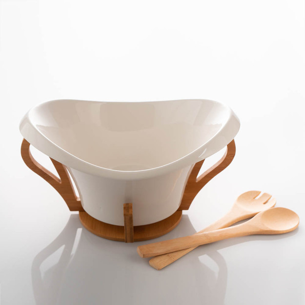 Тя има в комплекта бамбукова поставка и бамбукови прибори за сервиране на салата.