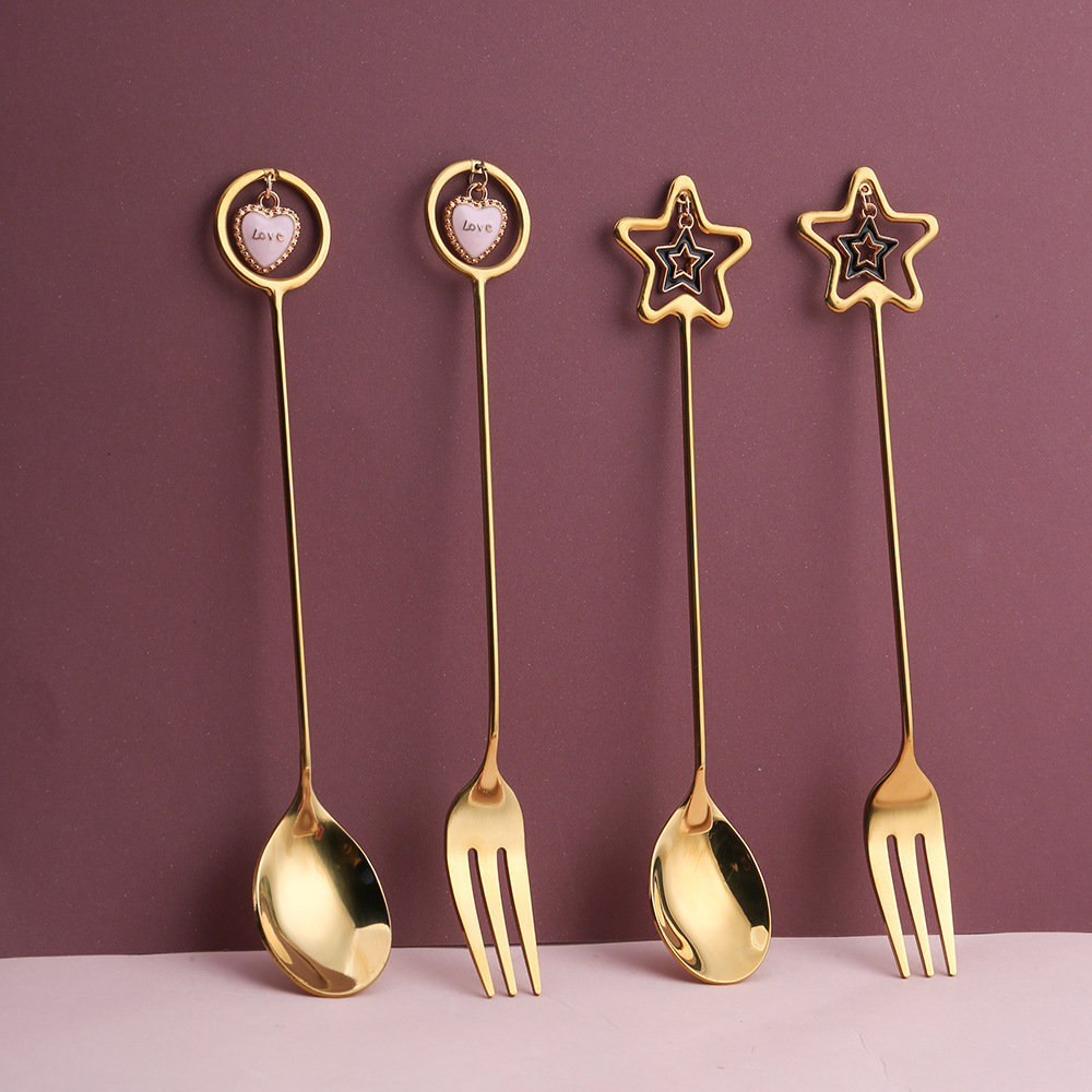 Завладяващи и елегантни, комплектът от 3 десертни лъжички и 3 десертни вилички "Сърце" е перфектното допълнение към вашия сервиз. Изработени от висококачествена неръждаема стомана в цвят "Злато", тези прибори са не само функционални, но и стилни.