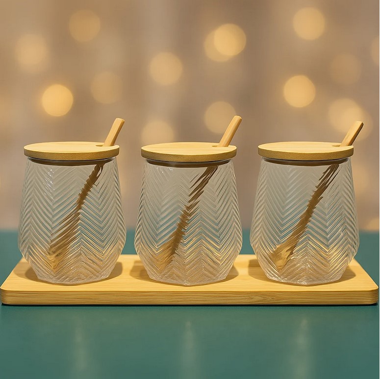Комплект 3 стъклени буркана върху бамбукова поставка