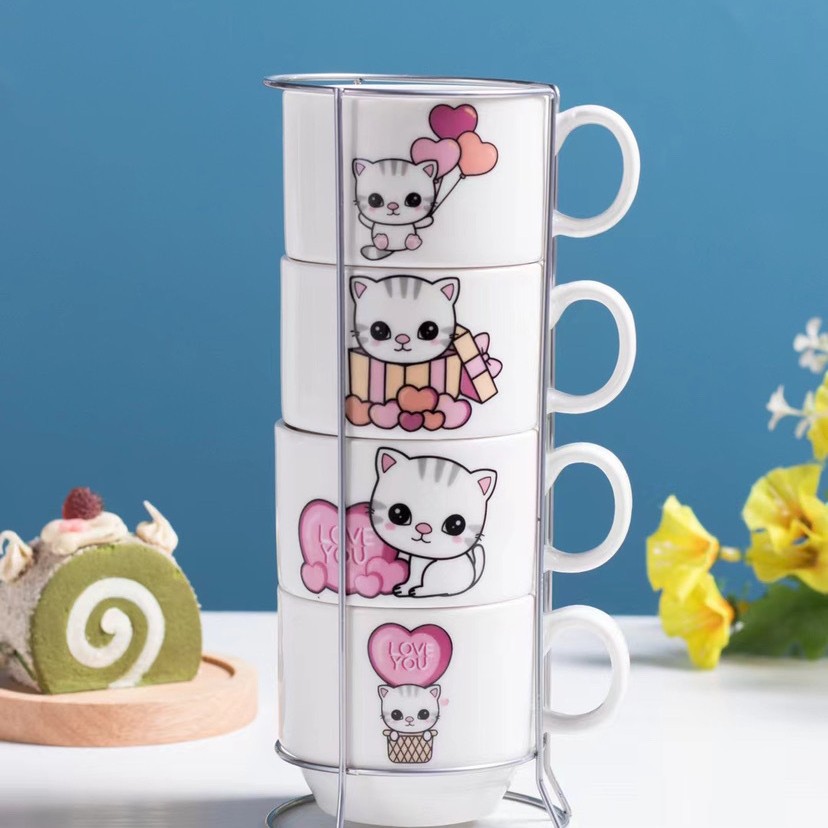 Комплект 4 керамични чаши 170 ml. с поставка "Cats"
