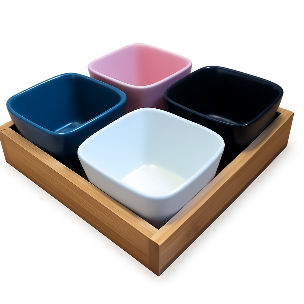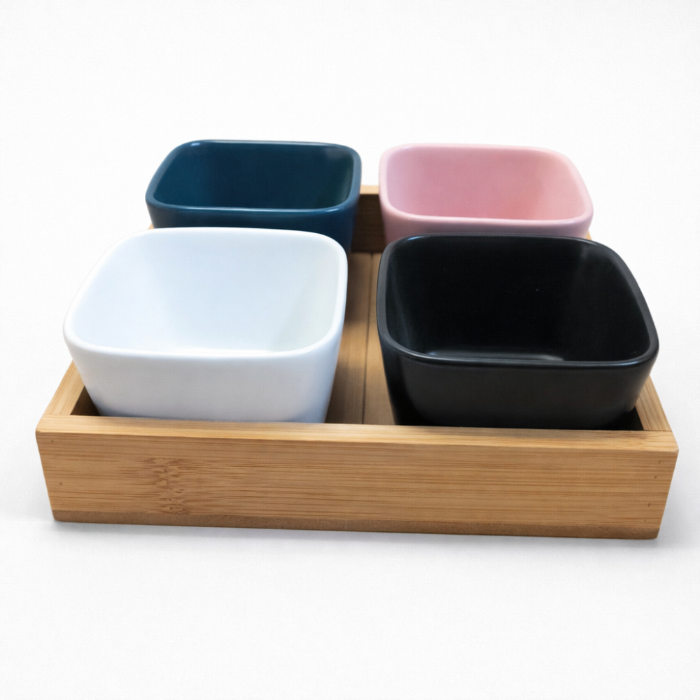 Внесете цвят и елегантност във всеки повод с този комплект от 4 керамични купички с дървена поставка. Перфектен за сервиране на ядки, сушени плодове, бонбони или плодове, той съчетава функционалност и стилен дизайн, подходящ както за ежедневна употреба, така и за специални събития.