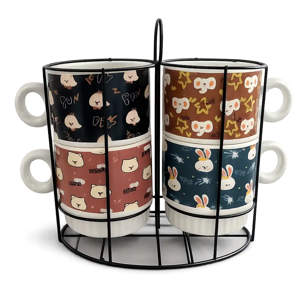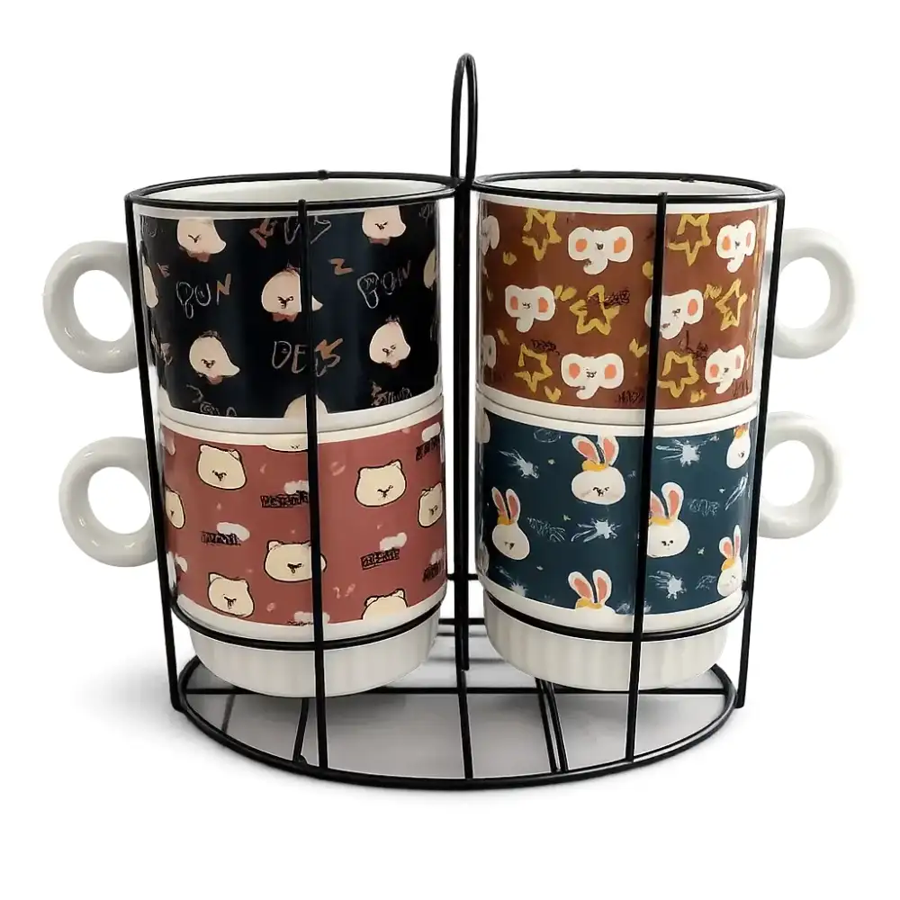 Комплектът съдържа 4 порцеланови чаши, подредени в удобна метална стойка.