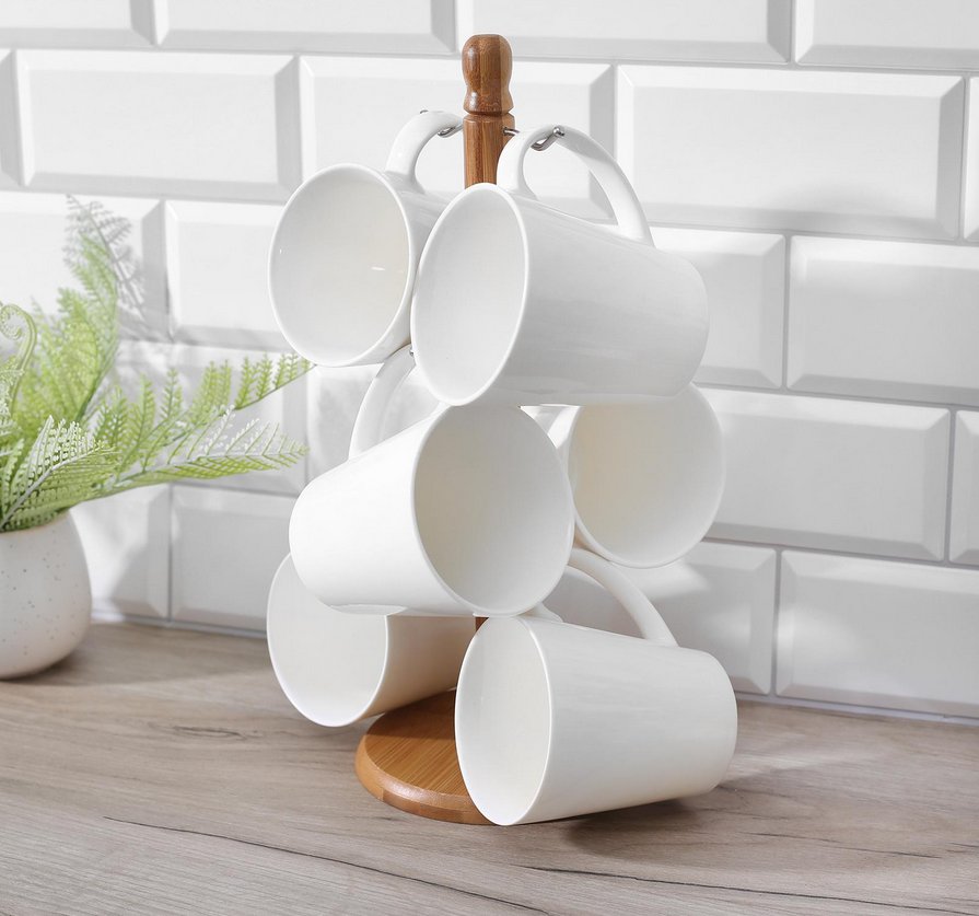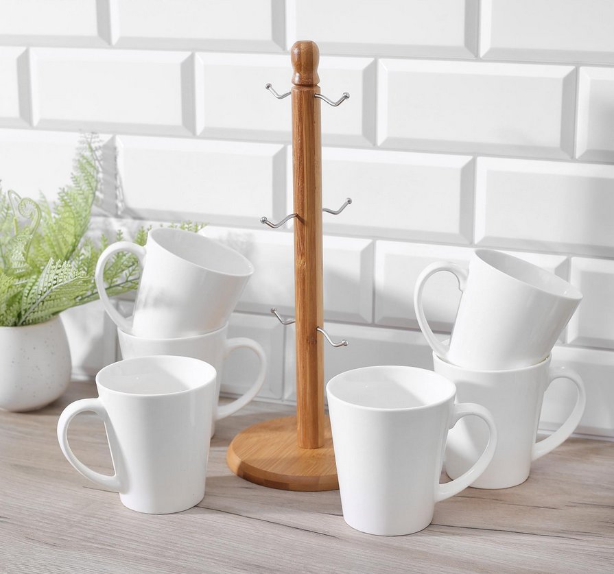 Чашите са от бяла керамика с вместимост 350 мл, на дървена поставка.
