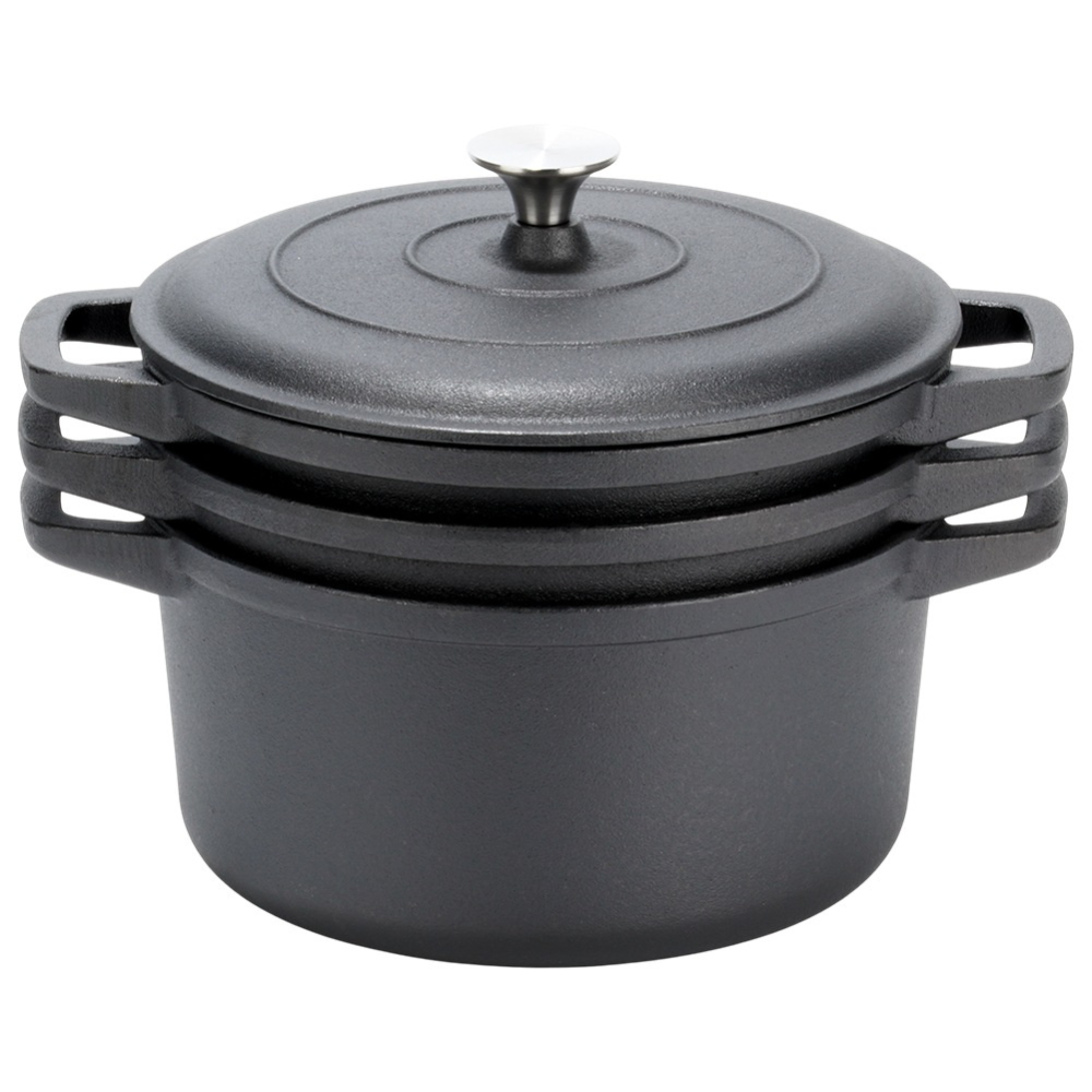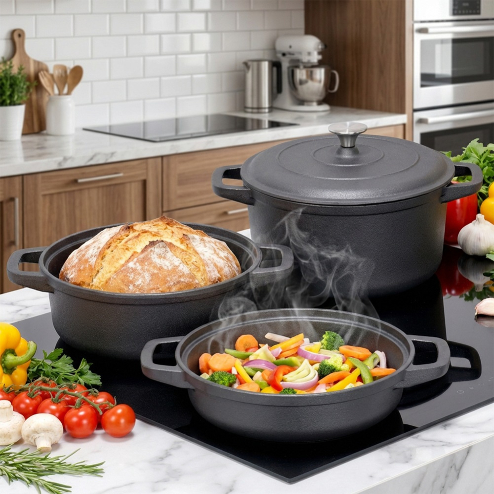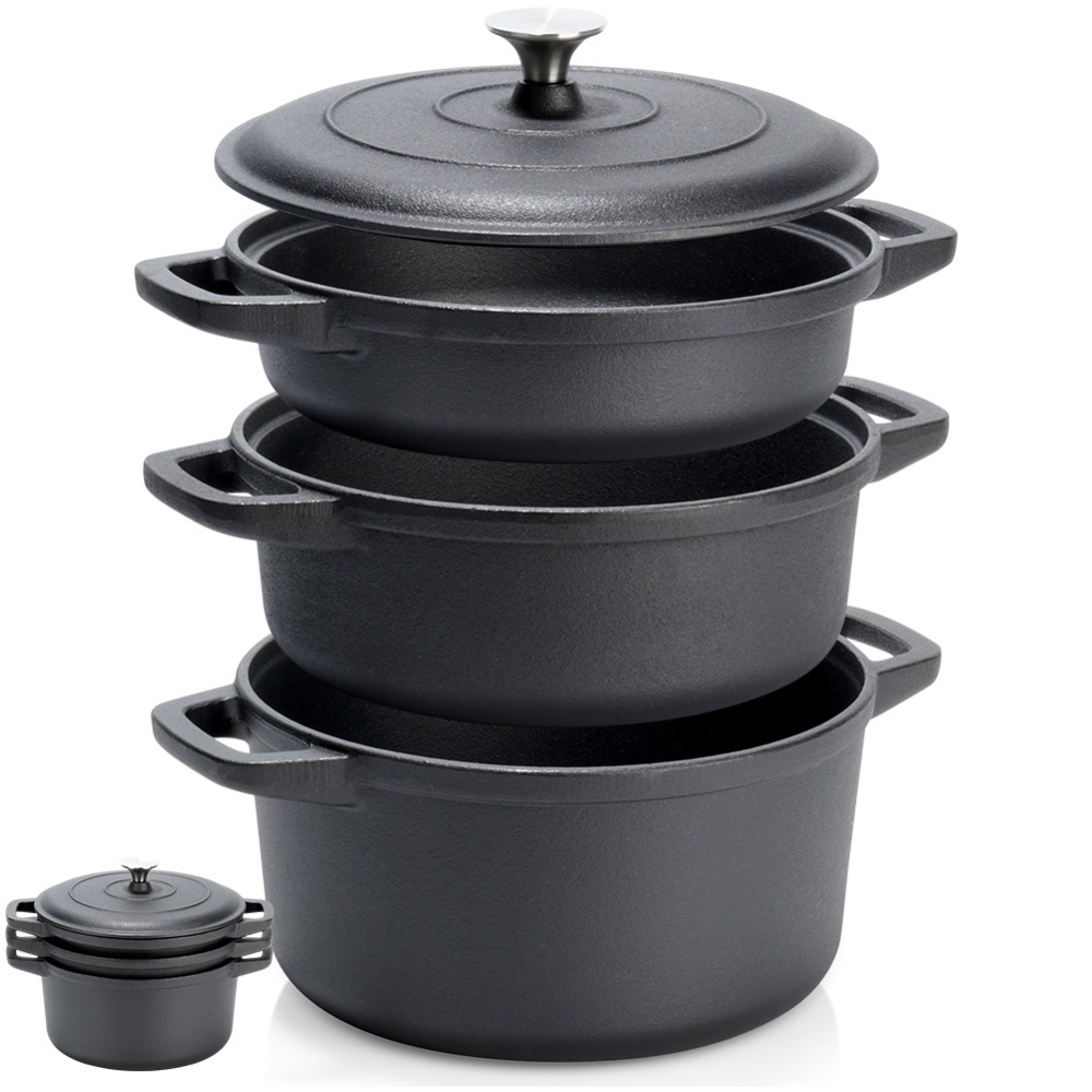 Този комплект чугунени тенджери позволява да приготвяте супи, яхнии, месо, зеленчуци и печива с отличен вкус и равномерна термична обработка. Всеки съд може да се използва самостоятелно, а стабилните странични дръжки осигуряват сигурно захващане.