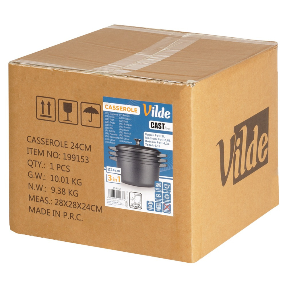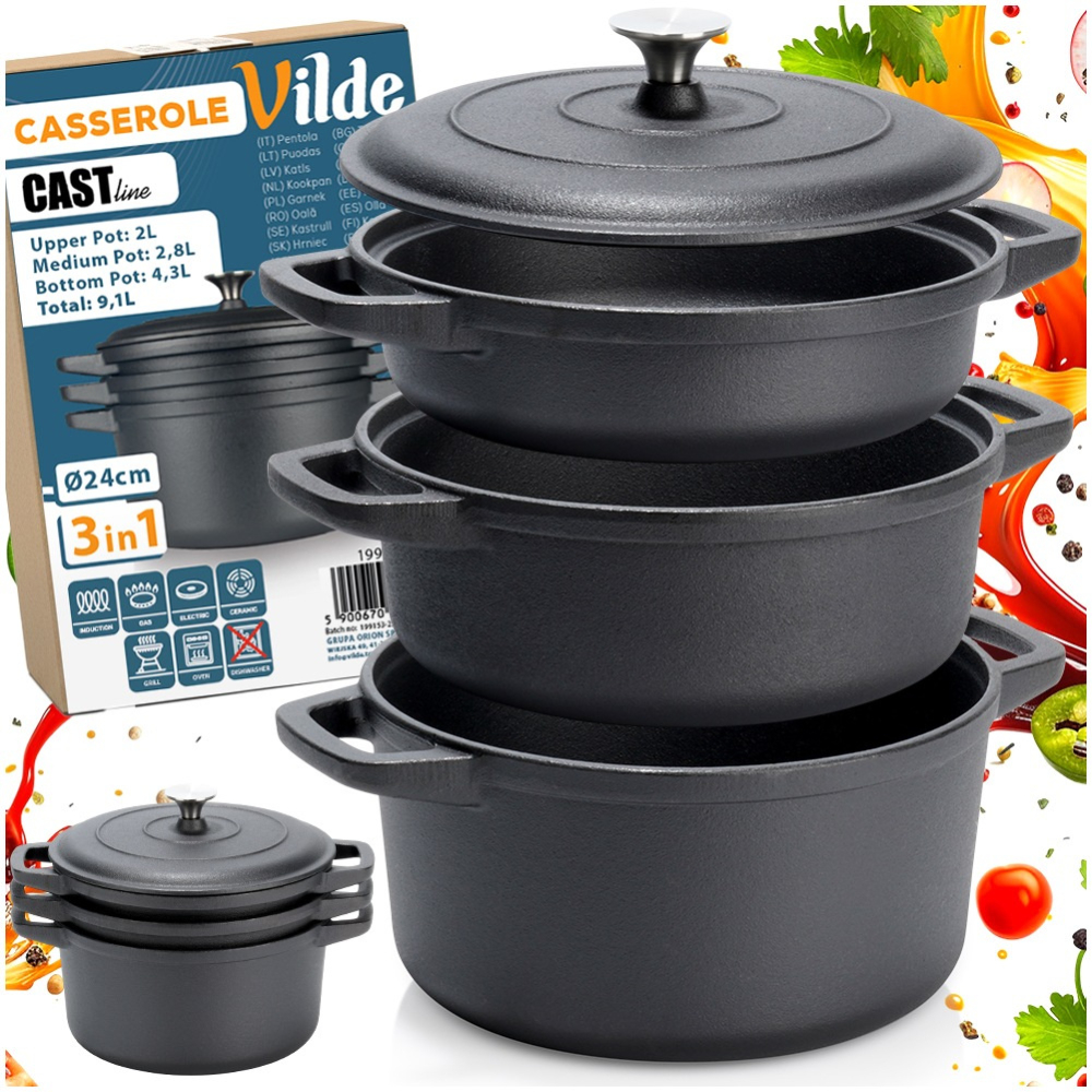 Комплект чугунени съдове с капак 3 в 1 CAST LINE Ø24 см е универсално решение за всяка кухня. Този чугунен комплект тенджери включва три съда с различен обем и капак, които могат да се използват поотделно или комбинирано. Благодарение на масивния чугун, съдовете разпределят топлината равномерно и я задържат дълго време за перфектно приготвени ястия.