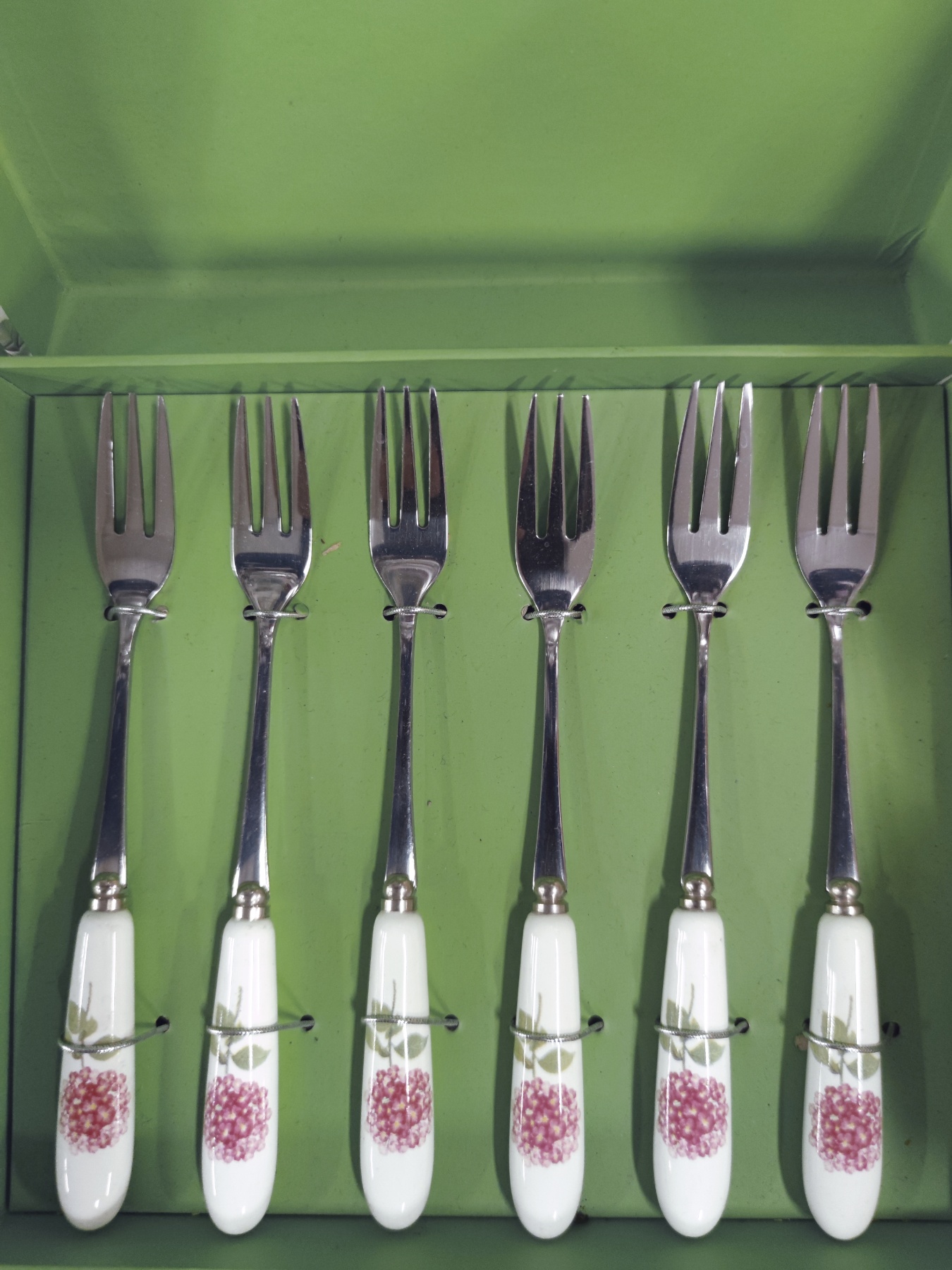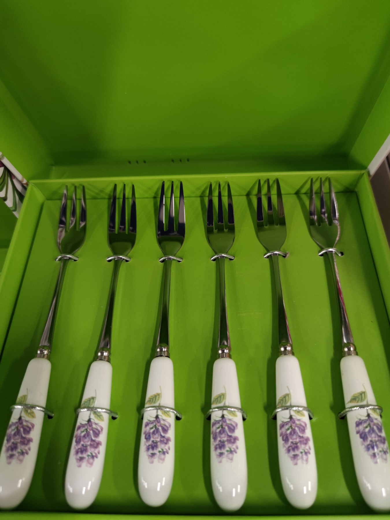 Разгледайте нашия комплект десертни вилички с керамични дръжки, представляващ идеалното допълнение към всяка сладка трапеза.