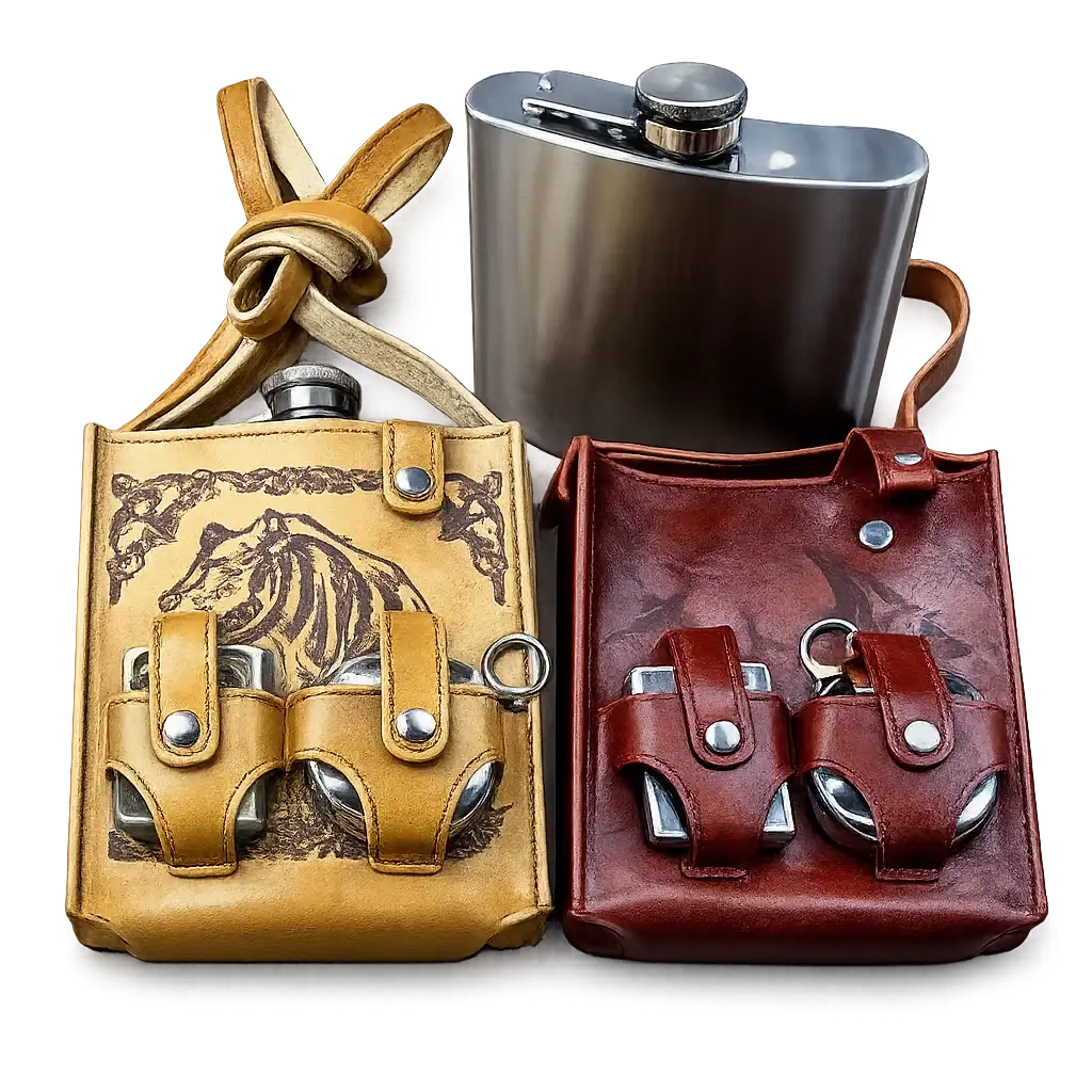 Комплект манерка с чаша и запалка в кожен калъф – практичен избор за приключения