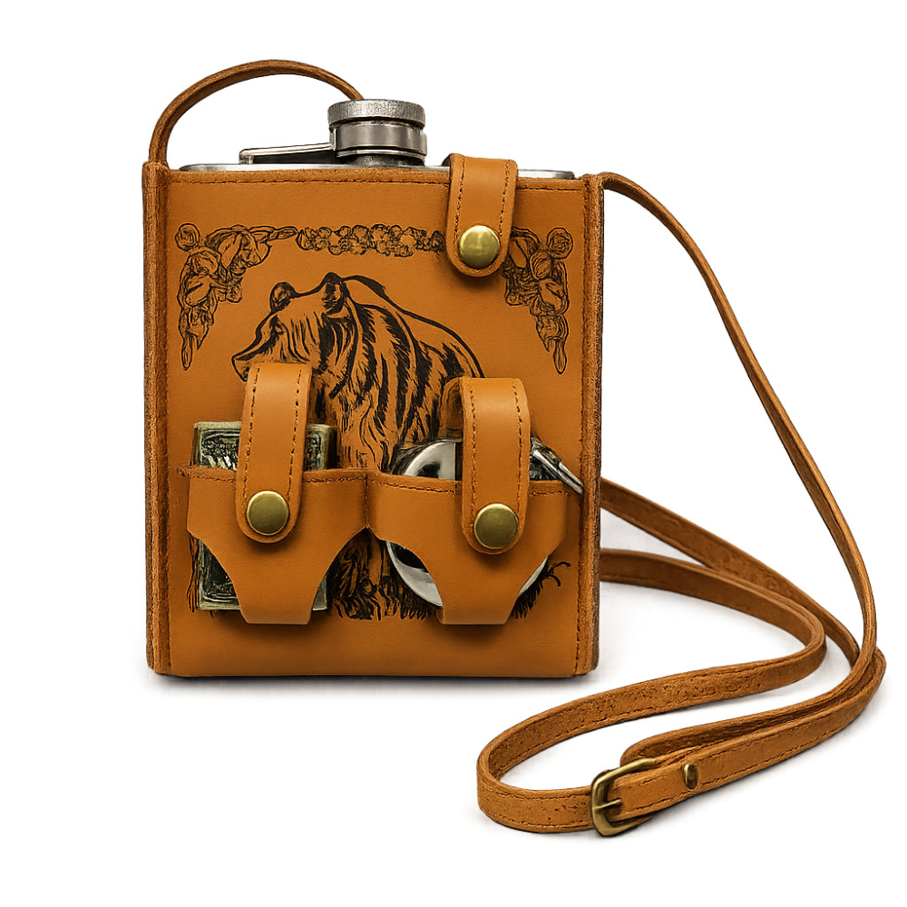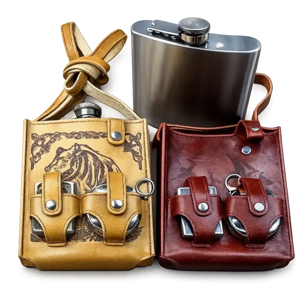 Този луксозен комплект за навън е идеален спътник при всяко приключение. Манерката и чашата от неръждаема стомана гарантират издръжливост, а включената запалка осигурява удобство във всяка ситуация. Коженият калъф не само придава стил, но и улеснява носенето.