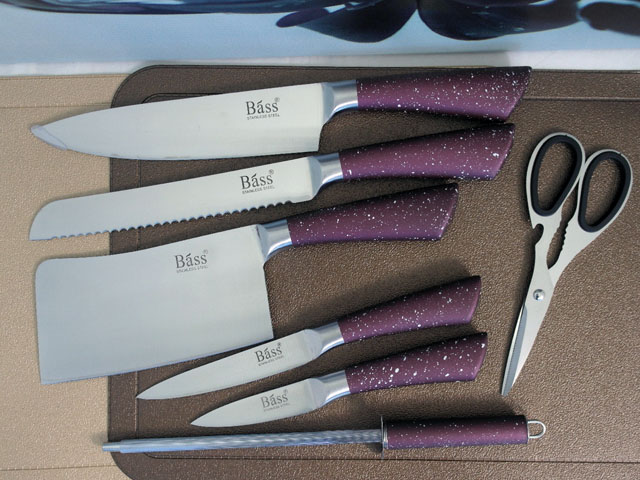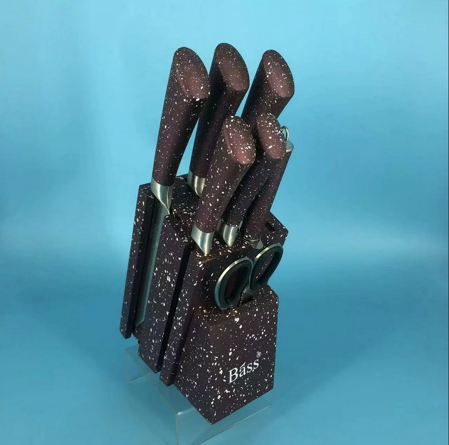 Комплектът ножове на поставка "BASS" в цвят мрамор - Бордо е идеалното допълнение към всяка кухня. Изработен от висококачествена неръждаема стомана и здрава пластмаса, този комплект предлага всичко необходимо за професионално рязане и нарязване.
