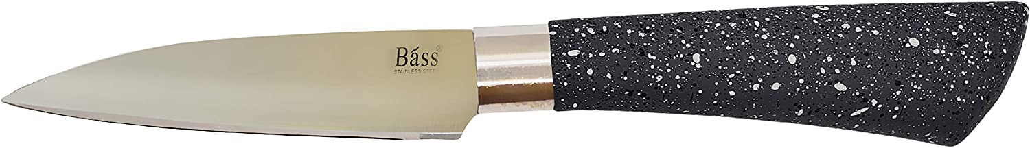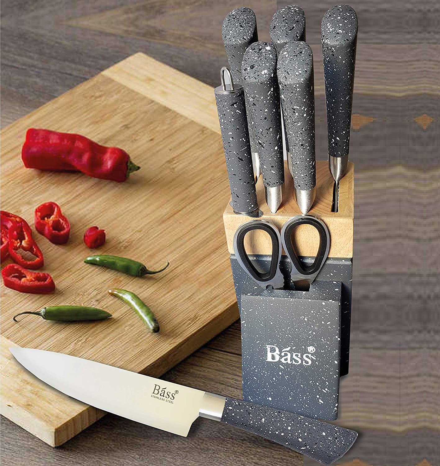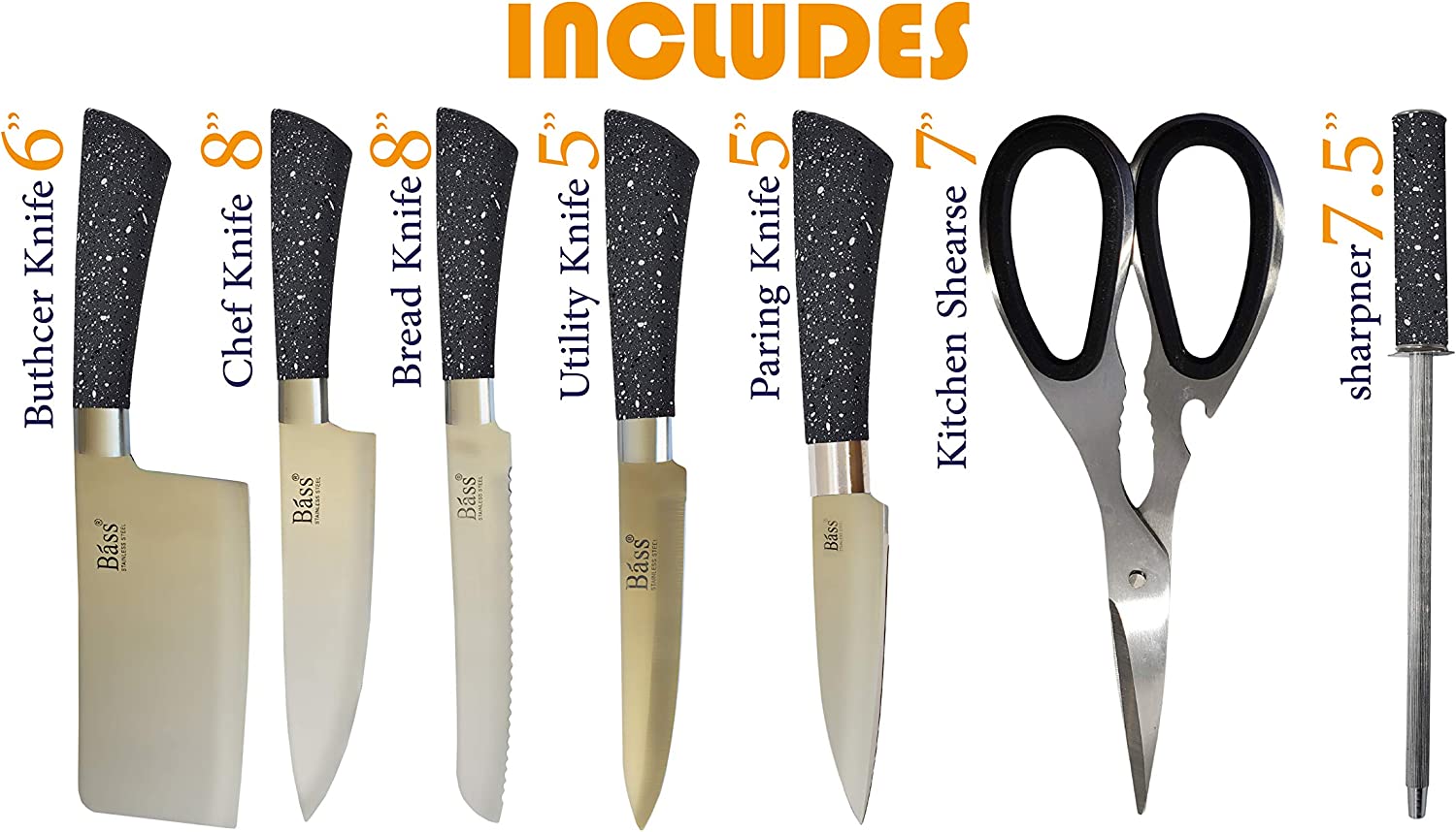 Комплетът включва сатър, хухненски нож, нож за плодове и универсален нож, точило и ножици.